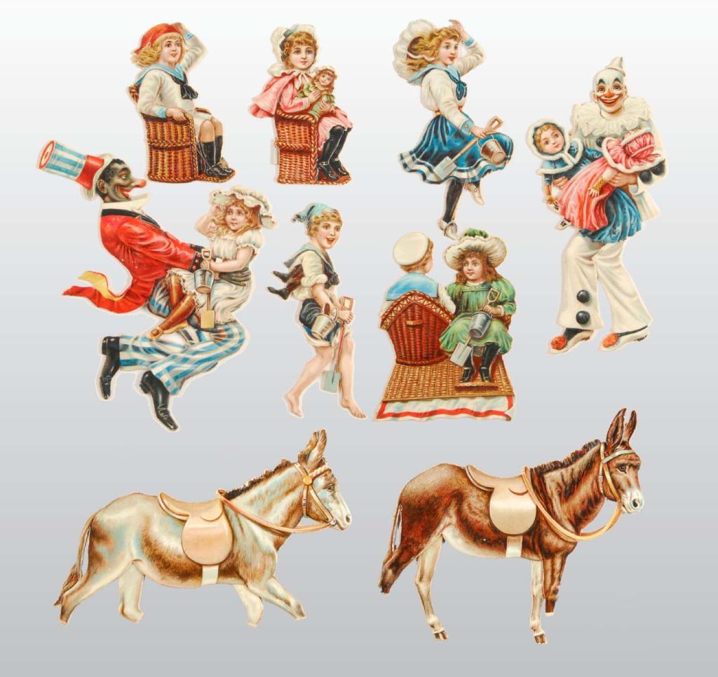 Description ND. This set, Novelty Series #145, has seven riders, two saddled donkeys and the original envelope. One animal is missing four feet, the other is missing two. The riders are children with sand pails, children in baskets and two clown figures. The dolls range from 4 to 7.5-inches and are able to 'mount' the donkeys. Not all figures have the Tuck pallet/ easel trademark. With the exception of the donkeys, "Fun" is in excellent condition. This set is pictured on page 36 of the Whitton book, "Collector's Guide to Raphael Tuck and Sons."