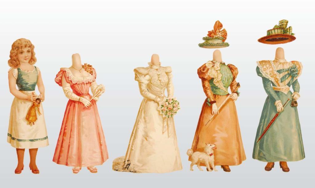 Description Circa 1890s. The 12.5-inch doll (no easel back) and her outfits are embossed. The clothing depicts six stages in the life of a woman, beginning with school days and ending in widow's weeds. Album paper is stuck on the skirt of the wedding gown. The set is in very good condition.