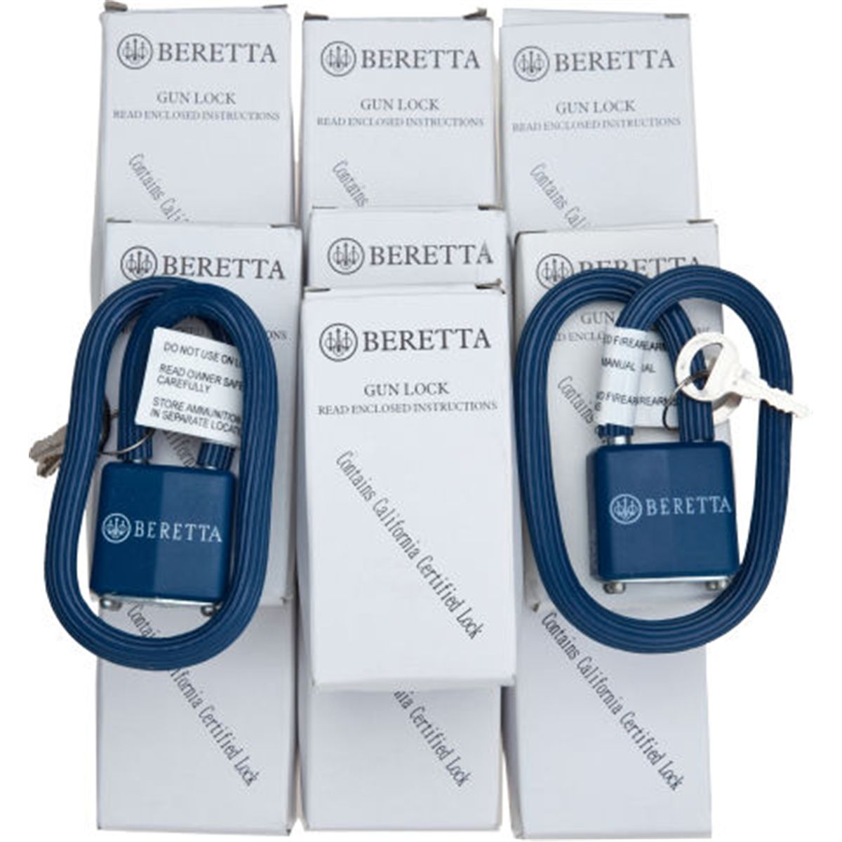 Lot of Twelve Boxed Beretta Gun Locks. Cable padlock with blue vinyl surface, Beretta logo in white, two keys. Contained in white cardboard box with instructions. Condition: New in box.NRA FIREARMS FOR FREEDOM PROGRAM