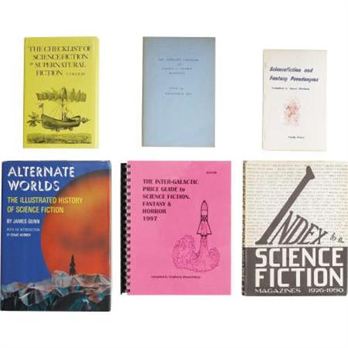 <B>Lot of Twelve Sci-Fi and Horror Reference Books</B></I>, including: <B>Donald B. Day, ed. </B></I><B><I>Index to the Science Fiction Magazines, 1926-1950</B></I></B></I>. Portland, OR: Perri Press [1952]. Quarto. 184 pages. Tan cloth with black titles on spine and front cover. Overall fine. Dust jacket is very good with some wear, small edge tears, and minor paper loss at head of spine. [and:] <B>Joseph H. Crawford, Jr., James J. Donahue and Donald M. Grant. </B></I><B><I>"333": A Bibliography of the Science-Fantasy Novel</B></I></B></I>. Providence, RI: The Grandon Company, 1953. Octavo. 80 pages. Stapled paper binding. Overall near fine with some wear. [and:] <B>Bradford M. Day. </B></I><B><I>The Complete Checklist of Science-Fiction Magazines</B></I></B></I>. New York: Science-Fiction and Fantasy Publication, 1961. Octavo. 63 pages. Stapled paper binding. Overall fine with minor fading and creasing. [and:] <B>James Gunn. </B></I><B><I>Alternate Worlds: The Illustrated History of Science Fiction</B></I></B></I>. Englewood Cliffs, NJ: Prentice-Hall, Inc. [1975] Quarto. 250 pages. Index. Blue cloth with gilt spine titles and orange cover decoration. Overall, book and dust jacket are fine. [and:] <B>Barry McGhan. </B></I><B><I>Sciencefiction and Fantasy Pseudonyms</B></I></B></I>. Dearborn, MI: Misfit Press, 1976. Octavo. 70 pages. Stapled paper covers. Overall near fine. [and:] <B>George Locke. </B></I><B><I>Science Fiction First Editions</B></I></B></I>. London: Ferret Fantasy, 1978. Limited first edition. Number 15 of 49 copies. Signed on the copyright page by the author. Octavo. 96 pages. Black cloth with gilt spine titles. Overall, book and dust jacket are fine. [and:] <B>E. F. Bleiler. </B></I><B><I>The Checklist of Science-Fiction and Supernatural Fiction</B></I></B></I>. Glen Rock, NJ: Fireball Books, 1978. Octavo. 266 pages. Black cloth with gilt spine titles. Overall, book and dust jacket are fine. [and:] <B>Stuart W. Wells III. </B></I><B><I>The Science Fiction and Heroic Fantasy Author Index</B></I></B></I>. Duluth, MN: Purple Unicorn Books, 1978. Octavo. 185 pages. Paper binding. Overall fine with minor wear. [and:]<B> David Pringle. </B></I><B><I>Science Fiction: The 100 Best Novels</B></I></B></I>. New York: Carroll and Graf Publishers, Inc., 1985. Octavo. 224 pages. Black cloth with silver spine titles. Some toning in the paper. Overall, book and dust jacket are fine. [and:] <B>James Cawthorn and Michael Moorcock. </B></I><B><I>Fantasy: The 100 Best Books</B></I></B></I>. New York: Carroll and Graf Publishers, Inc., 1988. Octavo. 216 pages. Green cloth with gilt spine titles. Overall, book and dust jacket are fine. [and:] <B>Stephen Jones and Kim Newman. </B></I><B><I>Horror: 100 Best Books</B></I></B></I>. New York: Carroll and Graf Publishers, Inc., 1988. Octavo. 256 pages. Green cloth with gilt spine titles. Overall, book and dust jacket are fine. [and:] <B>Stephanie Howlett-West, ed. </B></I><B><I>The Inter-Galactic Price Guide to Science-Fiction, Fantasy and Horror</B></I></B></I>. Modesto, CA: Stephanie Howlett-West, 1997. Quarto. 373 pages. Laminated paper covers with spiral binding. Overall fine. <I>From the Robert and Diane Yaspan Collection.</B></I><BR><BR><b>Shipping:</b> Books & Catalogs (<a target="_blank" href="http://www.heritageauctions.com/common/shipping.php">view shipping information</a>)