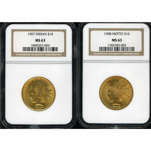 Includes: 1907 No Motto NGC MS63, 1908 Motto NGC MS63. Lot of 2 coins.