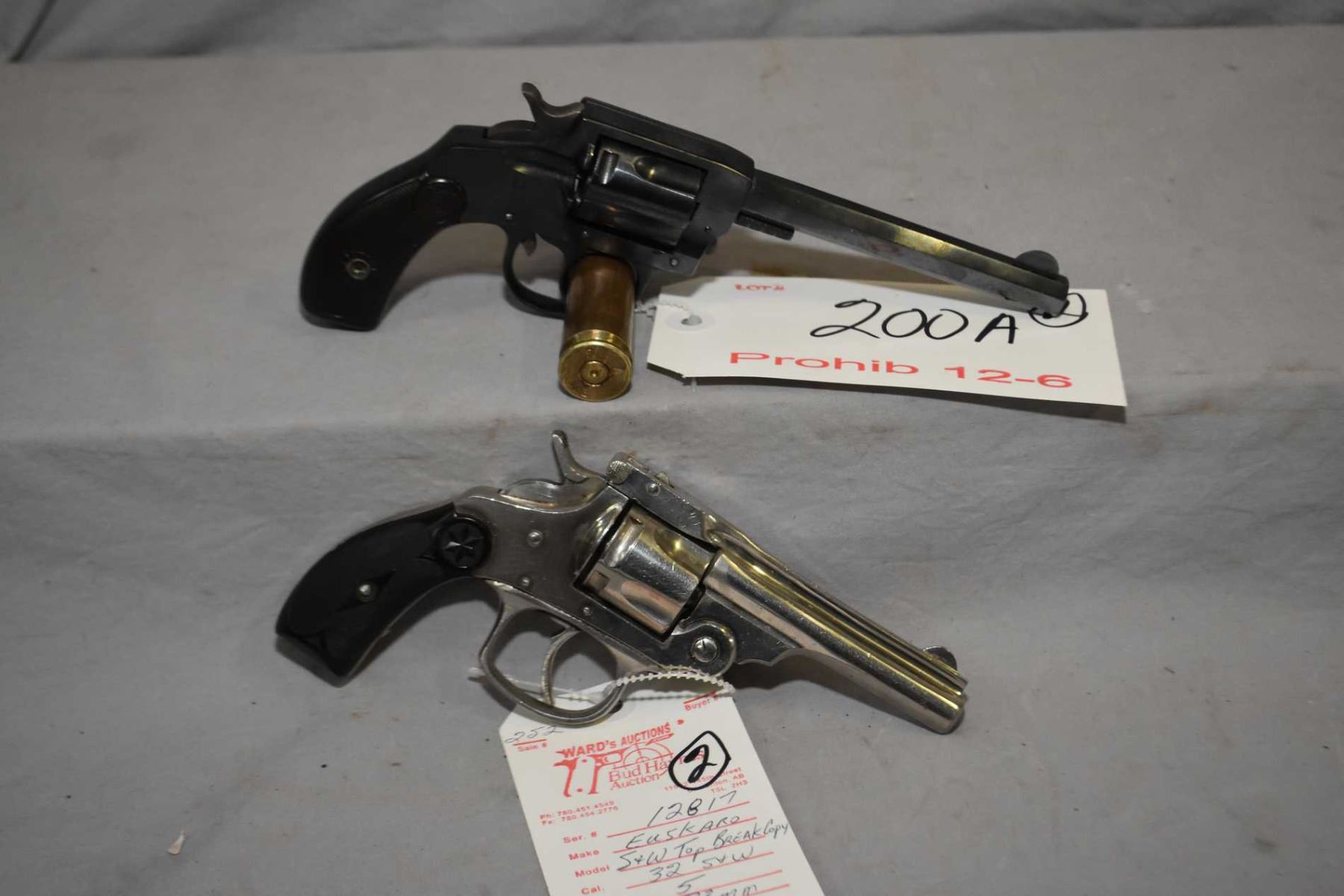 Lot of Two 12 - 6 Prohib Firearms : Harrington & Richardson Model Double Action 1905 .32 S & W Long Cal 5 Shot Revolver w/ 114 mm octagon bbl [ good blued finish w/ few marks, good checkered grips, needs work on trigger return spring ] Ser # 86131 Prohib 12 - 6 Cert # 9034053 FRT # 19592 - 2 - Prohib 12 - 6 Euskaro Model Smith & Wesson Top Break Copy .32 S & W Cal 5 Shot Revolver w/ 83 mm bbl [ nickel finish, small chip out of left grip, various marks and scratches to grips and metal ] Ser # 12817 Prohib 12 - 6 Cert # 9034233 FRT # 77073 - 2 EXPECT DELAYS IN TRANSFER
