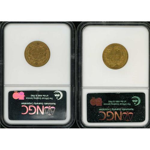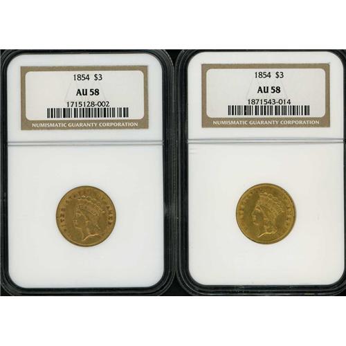 Lot includes 2- 1854 NGC AU 58 Three Dollar Gold pieces. Lot of two coins.