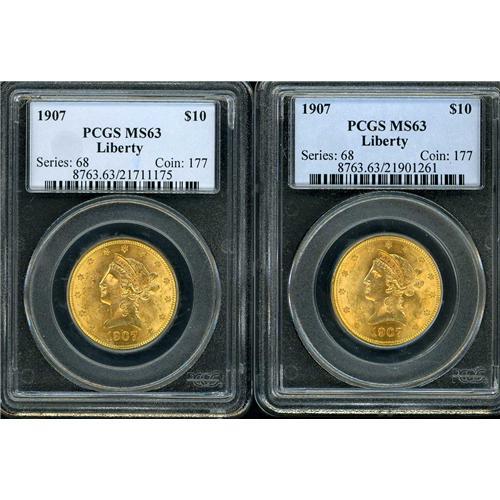 Includes: 1907 PCGS MS63, 1907 PCGS MS63. Lot of 2 coins.