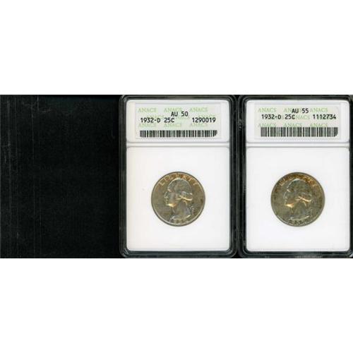 <b>Lot of Two 1932-D Washington Quarter Dollars.</b> Includes one ANACS graded AU55; the other ANACS graded AU50. Lot of 2 coins.