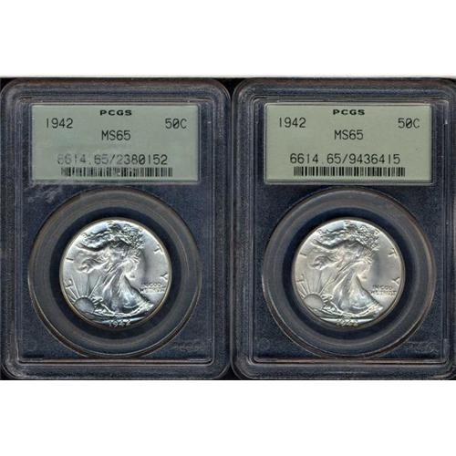 <b>Lot of Two 1942 Walking Liberty Half Dollars. PCGS graded MS65.</b> Lot of 2 coins.