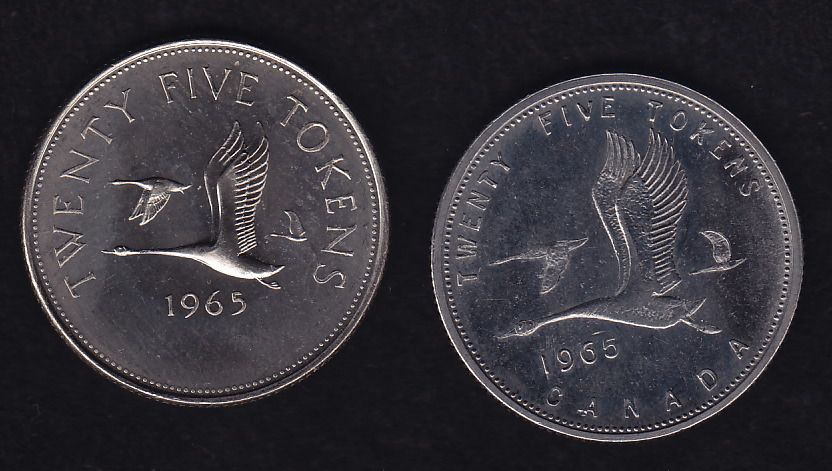 Lot of Two 1965 Twenty Five Cent Test Tokens - CH TT-25.1B & TT-25.3B. AU/UNC conditions. 2 Pcs.