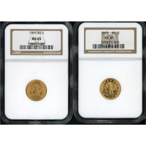 Includes: 1901 NGC MS65, 1903 NGC MS65. Lot of 2 coins.