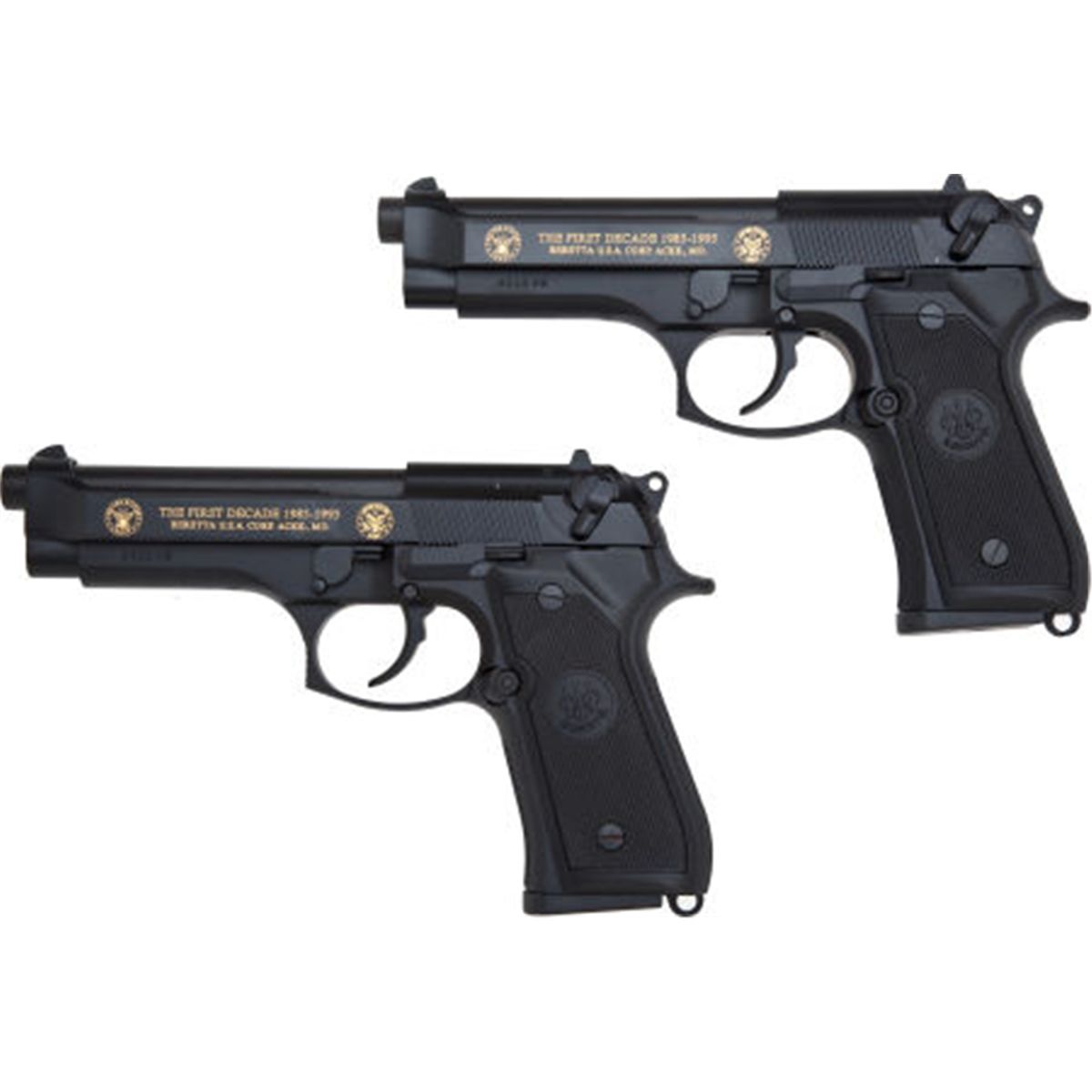 Lot of Two (2) Beretta M9 Limited Edition 9mm Semi-Automatic Pistols. Serial no. 0015M9 & 0016M9, 9mm, 4.9" barrel, matte black finish, black checkered plastics grips, gold U.S. Army and Navy logos with ""The First Decade 1985-1995"", ambidextrous safety (de-cocking lever), 3-dot fixed sights, each with one 15-shot magazine, manual, and factory plastic case, in Beretta cardboard box. MSR $643.Condition: As new in factory boxes. Bores are bright, actions are crisp. NRA FIREARMS FOR FREEDOM PROGRAM