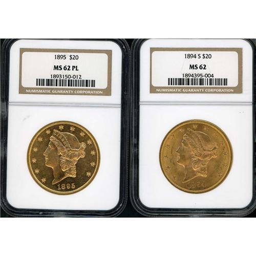 Includes: 1894 S NGC MS62, 1895 MS62 PL. Two unusually choice examples available together here. The 1894-S is very PQ with a possibility of being MS63. The 1895 displays lovely proof like surfaces. Lot of 2 coins.