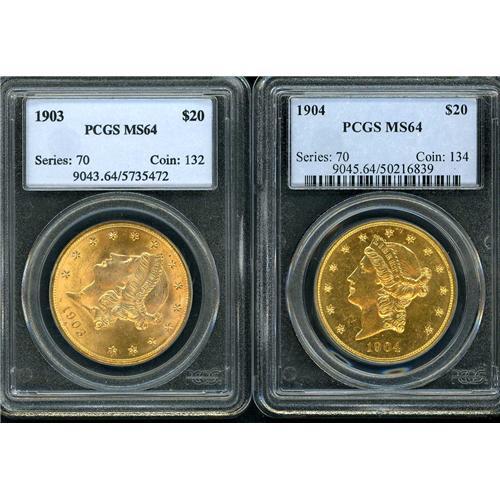 Lot includes: 1903 PCGS MS64, 1903 PCGS MS64. A lovely PQ pair. The 1903 is virtually mark-free as is the 1904, the latter having rare and desirable prooflike surfaces. Lot of 2 coins.
