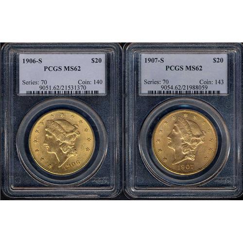 Lot includes: 1-1906-S PCGS MS62, 1-1907-S PCGS MS62. Lot of 2 coins.