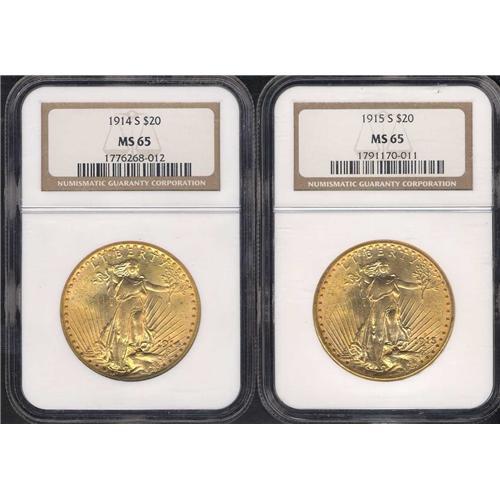 Includes: 1914-S NGC MS65, 1915-S NGC MS65. Lot of 2 coins.