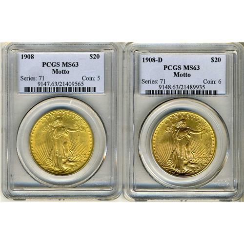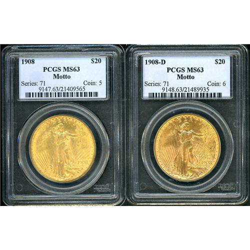 Lot includes: 1908 With Motto PCGS MS63, 1908-D With Motto PCGS MS63. Lot of 2 coins.
