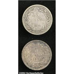 <B>Lot of Two 5 Francs,</B></I> KM736.2 1831-B Fine; and KM745.1 1831-A VF. Both coins have raised edge inscriptions. 2 coins <BR><BR><B>Important notice:</B> Heritage usually auctions material at the rate of 200-250 lots per hour. On some occasions eBay Live bid software or the Internet may not be able to keep up with the pace of the auction. We recommend placing a realistic absentee bid now as insurance to avoid disappointment. Occasionally the auctioneer may eliminate or reject an eBay Live bid, and the auctioneer may also reopen a lot after the close of the eBay live bidding (usually because we missed an audience bid), and may reject your bid even if it shows you as the winning bidder. By bidding via eBay Live, you agree that Heritage may award the lot to another bidder at its sole discretion under the circumstances described above or any other reasonable circumstances. Since eBay bids are not shown to us until we open the lot on the floor, we treat those bids just like floor bids. In most cases the floor responds before the eBay bid is presented to us, due to Internet lag time, so for consistency we have made it a policy that floor bids are always considered first over tie eBay live bids. Also please note that all Heritage lots purchased through eBay Live carry a 20% Buyer's Premium. Please make sure you read the Terms and Conditions before you bid.