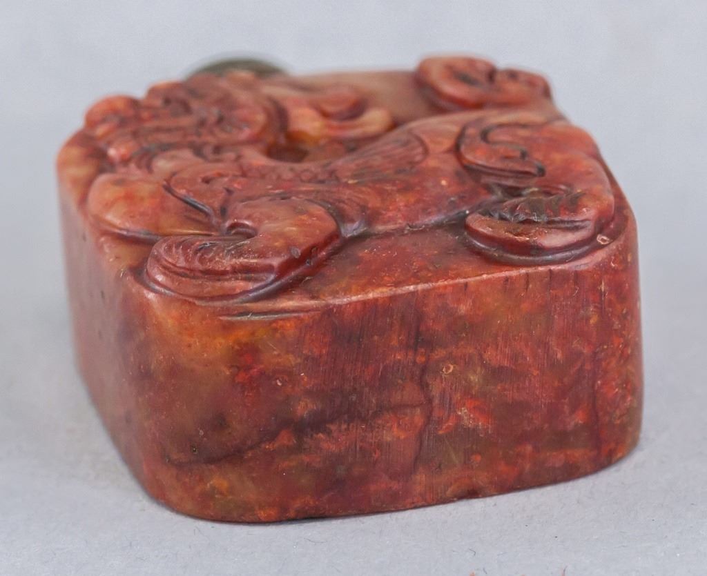 Lot of two (2) agate carved snuff bottles. On of red tone with striations. Other of orange tone carved with mythical creature. 6 x 5.5 cm, 93 grams and 6 x 4 cm, 94 grams.