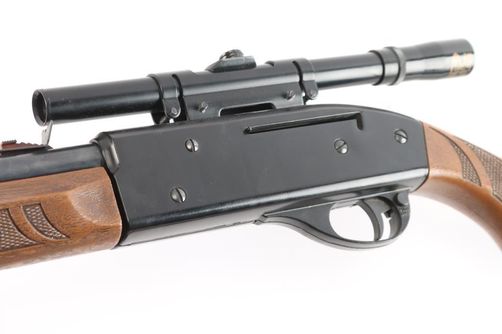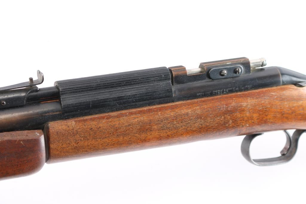 Sheridan "Blue Streak". American-made, pneumatic pump-action air rifle, chambered in .20 caliber (5mm) Features a blue-finished barrel and walnut stock, usually producing velocities up to 675 fps. Older model manufactured in Racine, Wisconsin (pre-Crosman acquisition) are highly sought after by collectors and shooters alike for their superior build quality. In good working order. 2) Crosman Model 766, .177 cal. Push button safety, sporting sights, mounted with a K-Mart All-Pro 4x15 scope . fine crosshair reticle, clear optics. There is no compression when lever is pumped, otherwise very good condition.