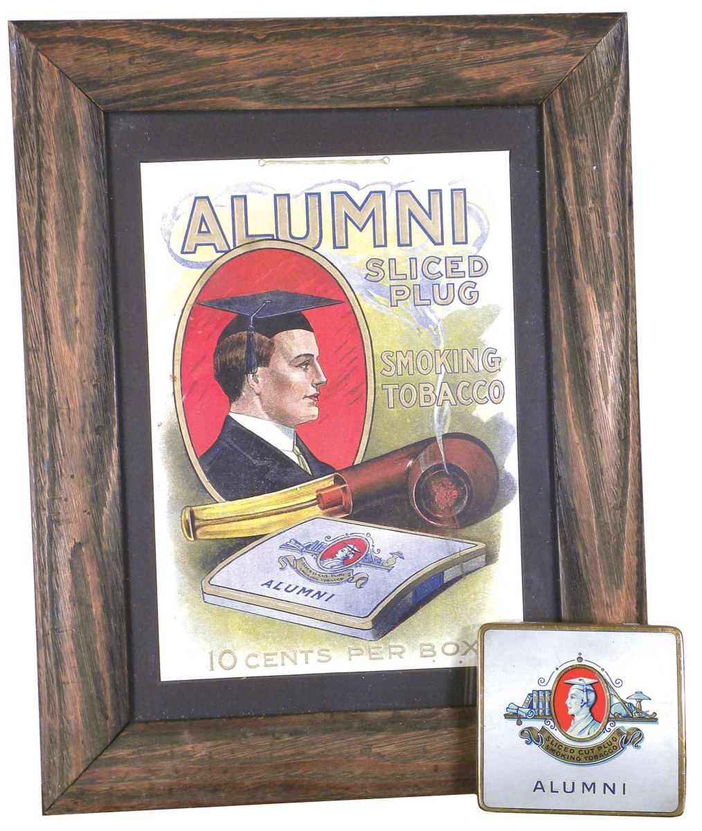 Lot of Two Alumni Smoking Tobacco Items including a cardboard string hanger sign, framed and a smoking tin. Both in good condition. Start Price $30