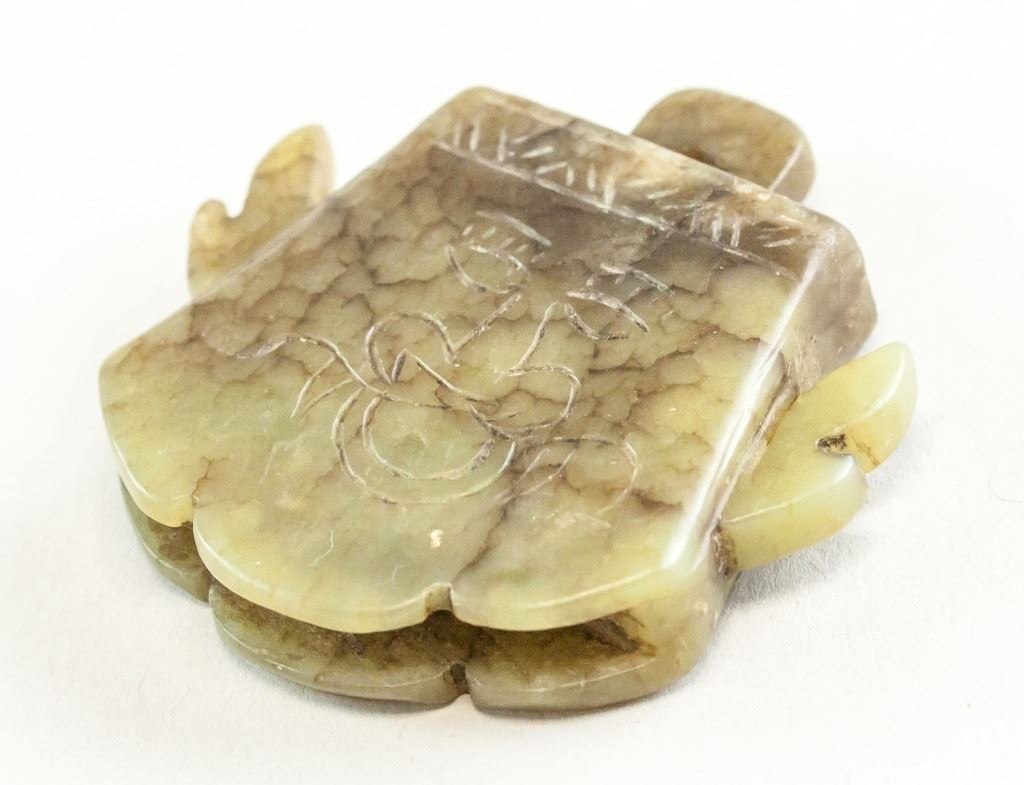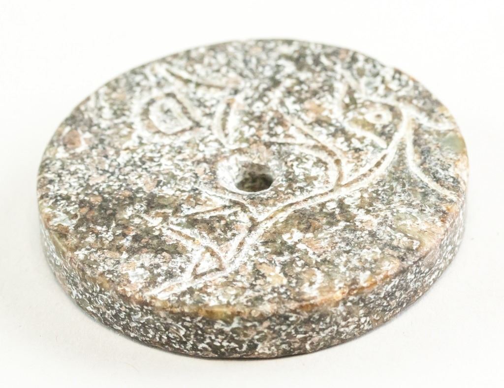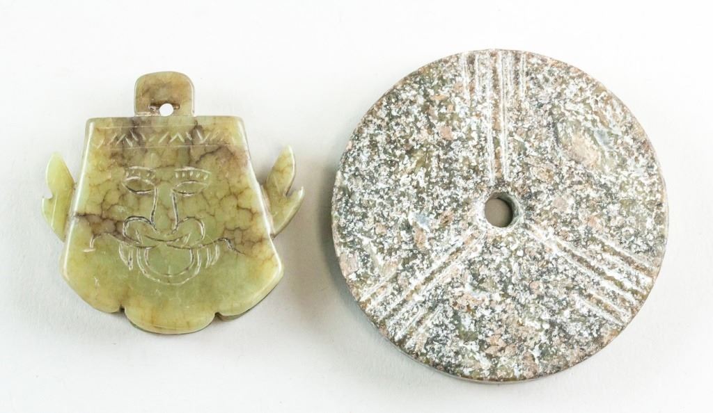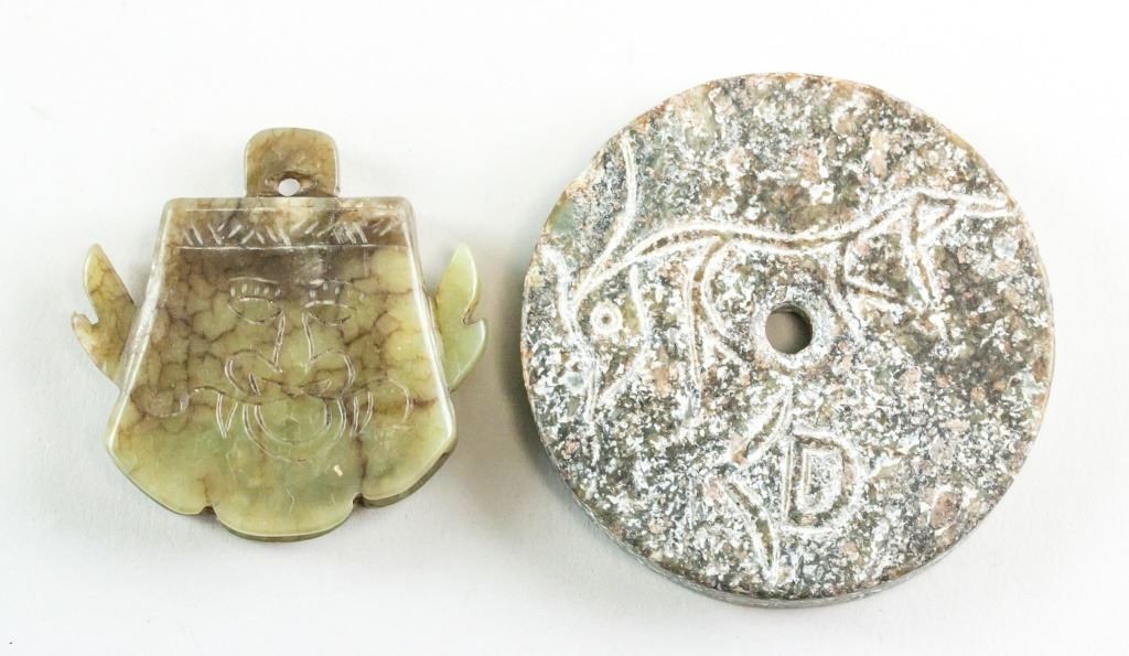 Lot of two (2) Chinese archaistic jade carved pendants. One carved with a face. One a circle with a hole in the center. Diameter: 6 cm, 126 grams (total).