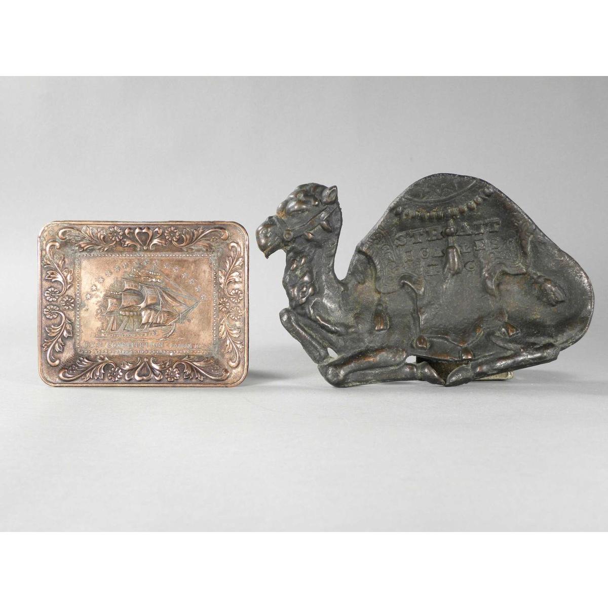 Lot of Two Ashtrays including a copper plated metal U.S.S. Constitution Souvenir, Boston, Mass and a cast iron camel advertising Straight Scales, Kansas City. Camel measures 6 1/2 X 5 inches.
