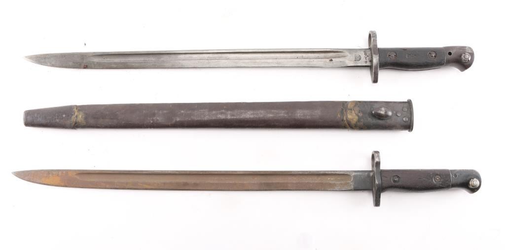 2) WW 1 - 1907 bayonet , 17" blade , ricasso stamped with "G.R", "1907" and "Sanderson" under crown and dated 5-18, on left side. Broad arrow, inspection stamp, reissue mark "24" & bend mark, on right side. Has rust and pitting on top and left side.