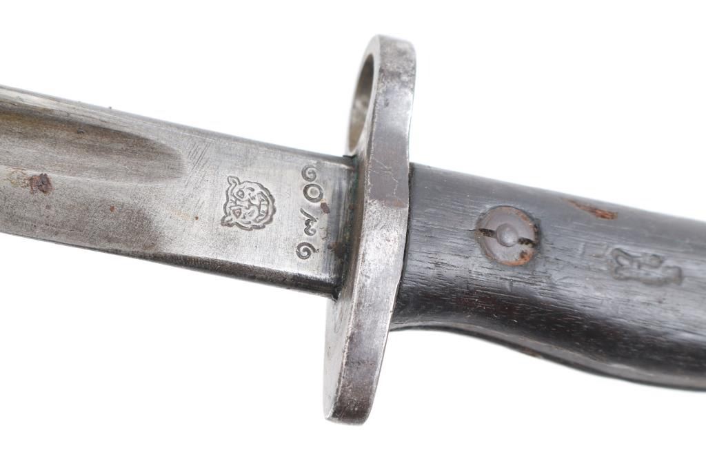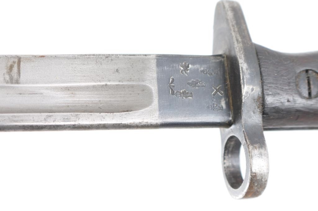 1) Siamese type 62, 17" bayonet ( contract British pattern 1907 bayonet for the SMLE No.1 Mk.III rifles) with original Siamese metal scabbard, bayonet and scabbard are in very good condition. Has image of a smiling tiger, and Siamese writhing on the ricasso. 1920 the king of Siam Vajiravudh, also known as Rama VI, during his time studying in England became an avid admirer of the Lee-Enfield SMLE. He then ordered 10,000 SMLE (short magazine lee Enfield n.1 mk3) for his personal Regiment "The Wild Tiger Corps". The Regiment also included his personal Royal Guards.