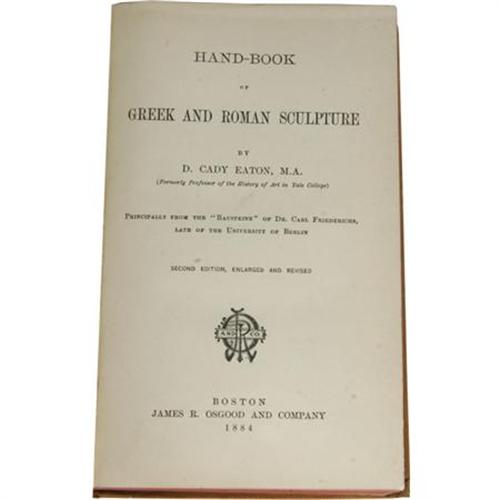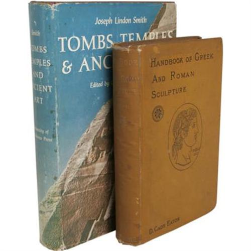 <B>Lot of Two Books Relating to the Ancient World,</B></I> including: Joseph Lindon Smith, <B><I>Tombs, Temples & Ancient Art</B></I>,</B></I> ed. Corinna Lindon Smith, (Norman, University of Oklahoma Press, 1956), 349 pages, 8vo, 6.25 x 9.25, inscribed and signed by the author, dust jacket shows wear, chipped, the book is tight and very good; and, D. Cady Eaton, <B><I>Handbook of Greek and Roman Sculpture</B></I>,</B></I> (Boston: James R. Osgood and Company, 1884), 415 pages, 12mo (5.25 x 7.75), stamped Mary A. Burnham School, previous owner's names in pencil, shelf wear and tearing to the top and bottom of the spine else good.<BR><BR><b>Shipping:</b> Books & Catalogs (<a target="_blank" href="http://www.heritageauctions.com/common/shipping.php">view shipping information</a>)