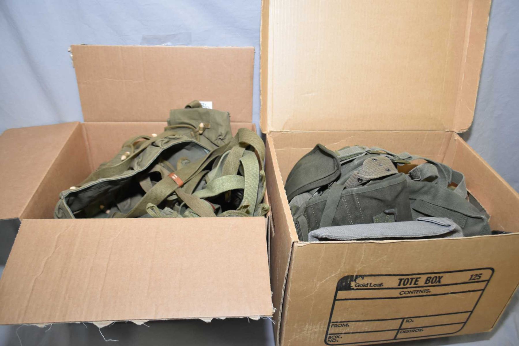Lot of Two Boxes : Military web pouches, belts, some U.S. Marked , cartridge belts with wooden toggl