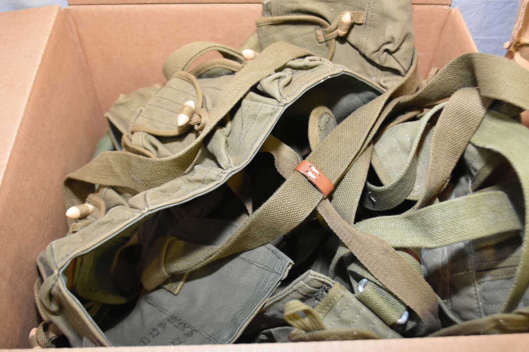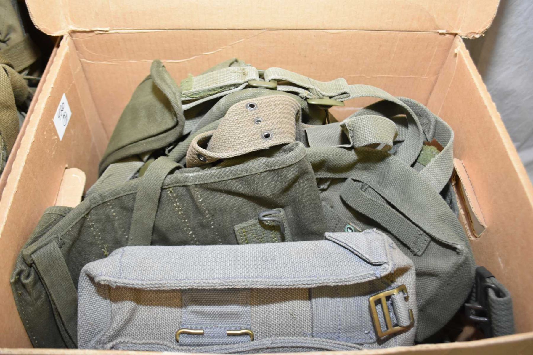 Lot of Two Boxes : Military web pouches, belts, some U.S. Marked , cartridge belts with wooden toggles, good lot !