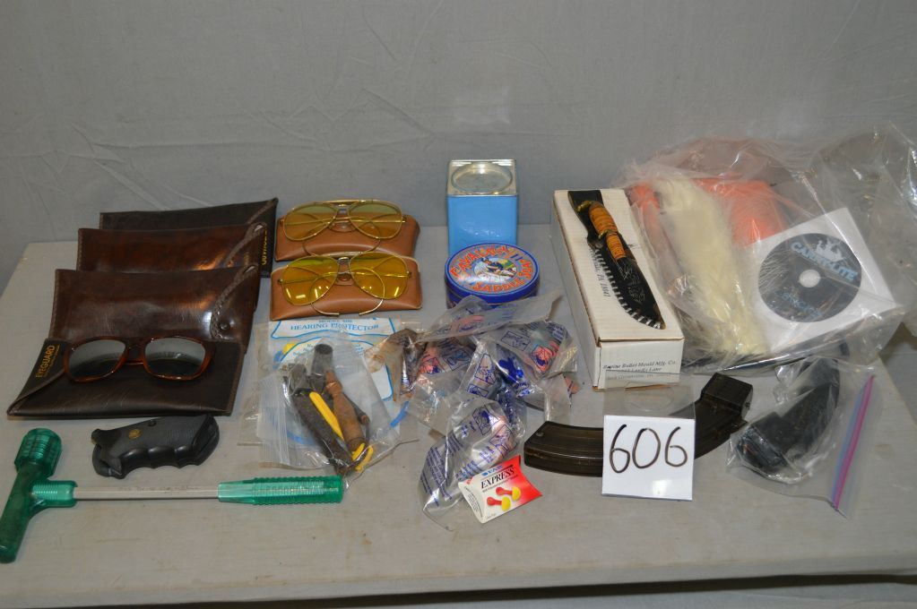 Lot of Two Boxes : Shooting glasses, ear plugs, etc - Carry Lite Easy Buck in pkg w/ cd disc, - Eagle Ruger 1022 Mag - 1022 mag - Pr Pachmayr grips - Kinetic bullet puller - two knives & sheath - sight parts in mold box, etc.