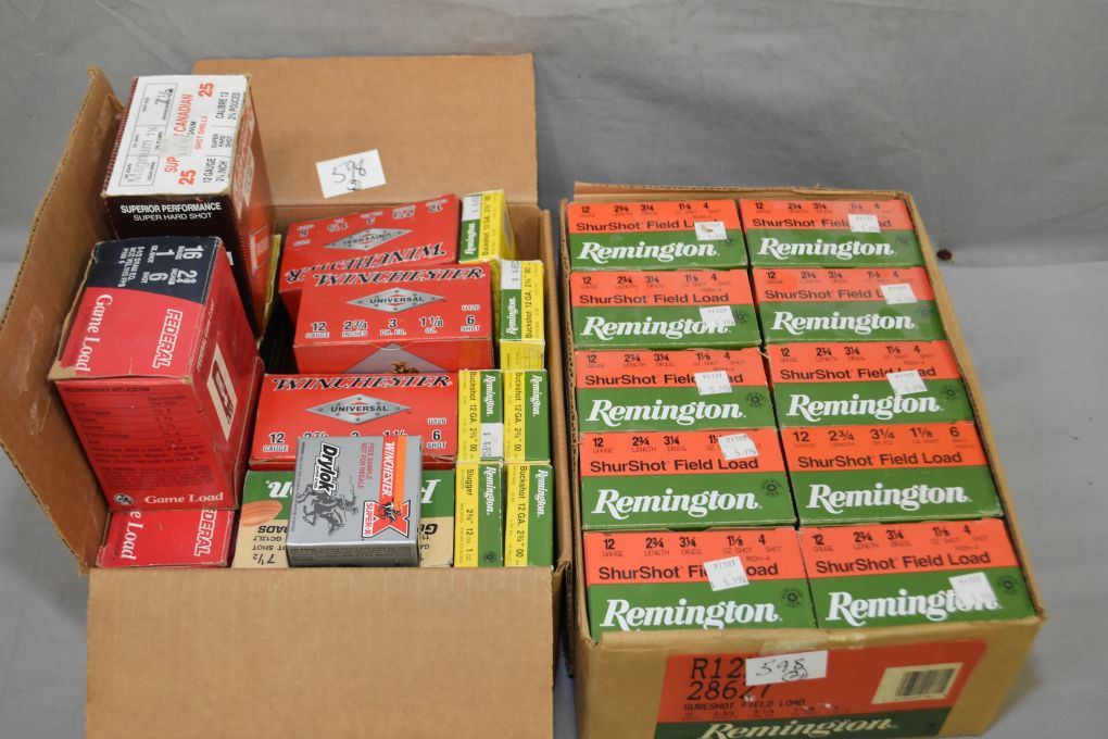 Lot of Two Boxes : Various Shotgun Shells - .12 Ga - .16 Ga - 10 Boxes Remington .12 Ga 2 3/4 Various Makers - Approx. 6 & Part Boxes Mostly .12 Ga Shotgun Shells