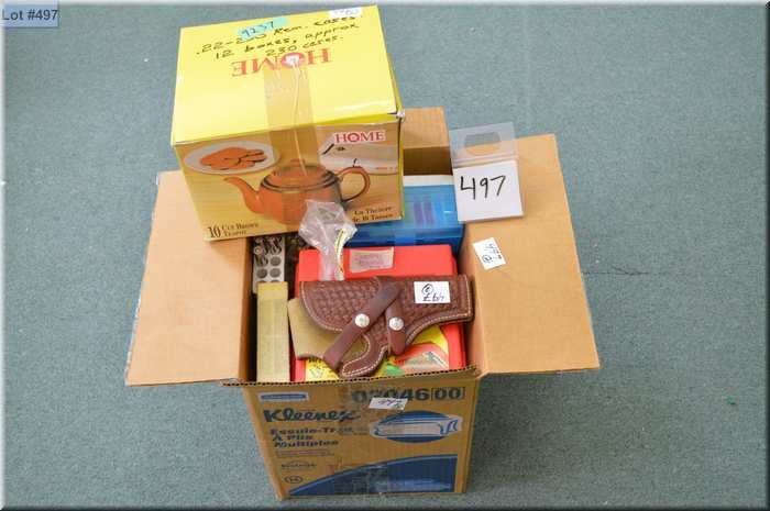 Lot of Two Boxes : empty dummy rounds, Lawrence holster, approx 230 rnds .22-250 rnds brass - etc.