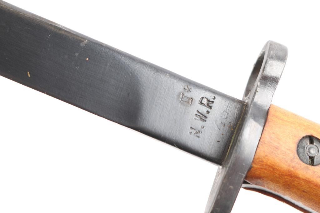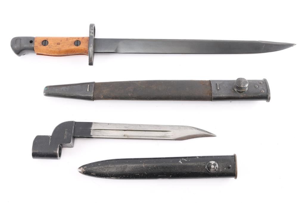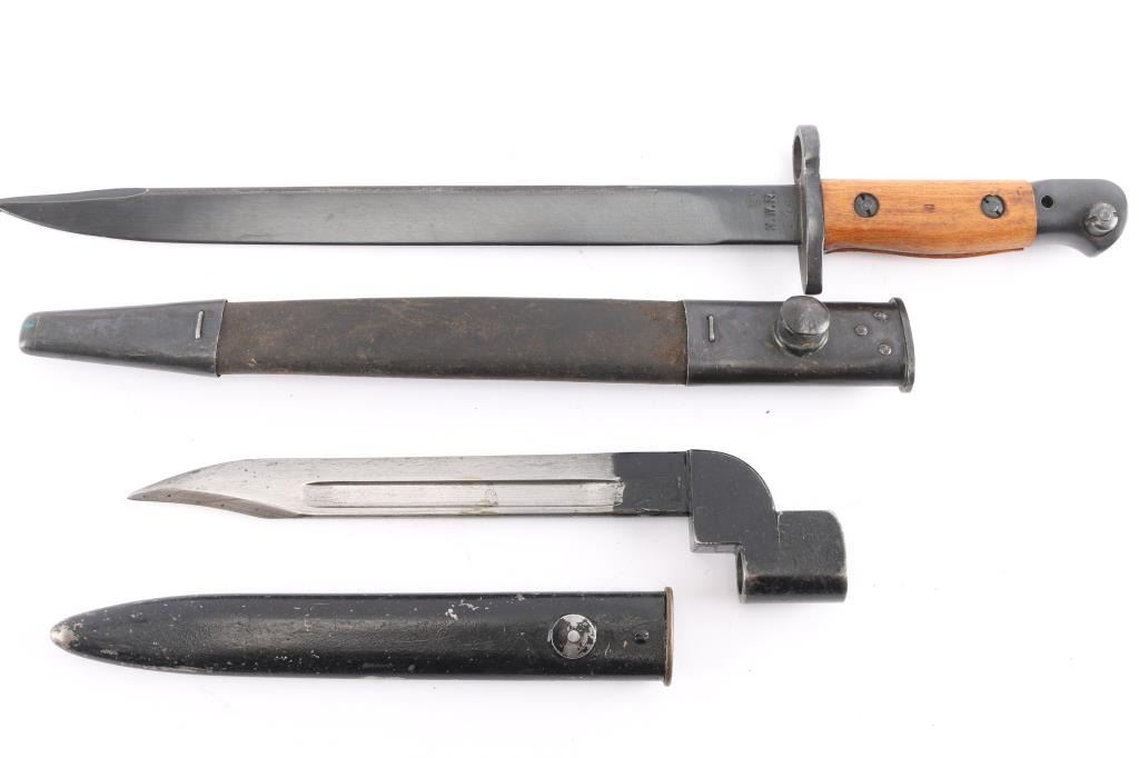1) British No, 9 MK I Enfield blade bayonet, with broad arrow, dated 53, number matched with scabbard. ROF Fazakerly PF marked. 2) British 1907 'India" pattern No.9 MK II Enfield bayonet. Type MK II* and the manufacturer N.W.R marked on ricasso, produced by the North Western Railway workshops in India during World War II. Leather scabbard with metal fittings. Both in very good condition.