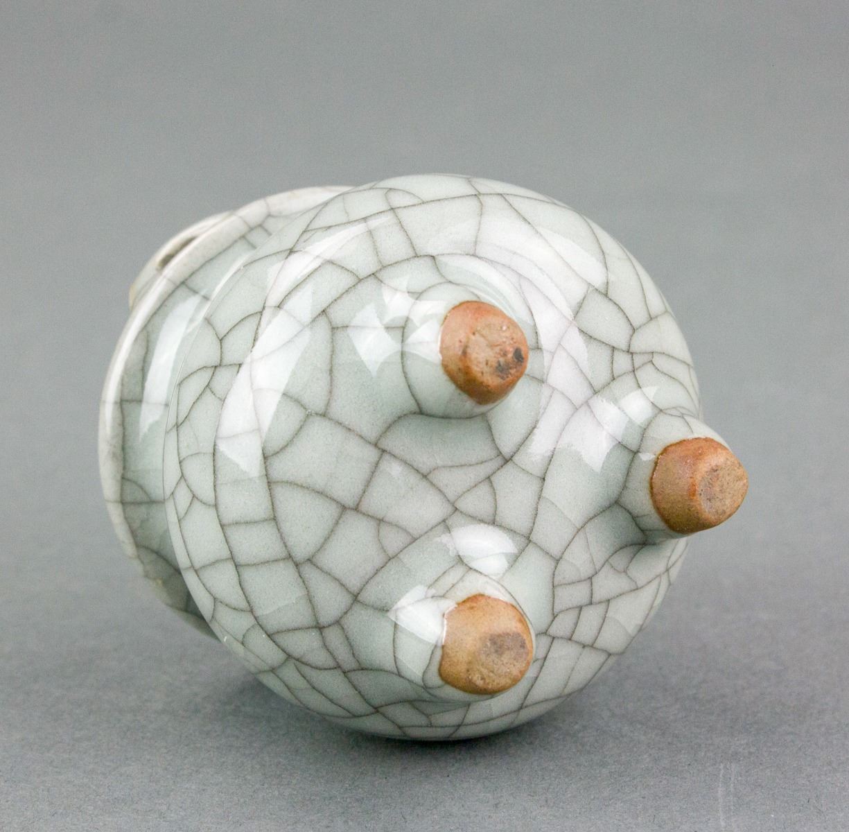 Lot of two Chinese celadon-glazed porcelain items; consist of one foliated bowl and one tripod censer; both covered in crackle celadon glaze; Bowl H: 6 cm, D: 13 cm; Censer H: 6 cm, D: 5 cm, 415 grams total