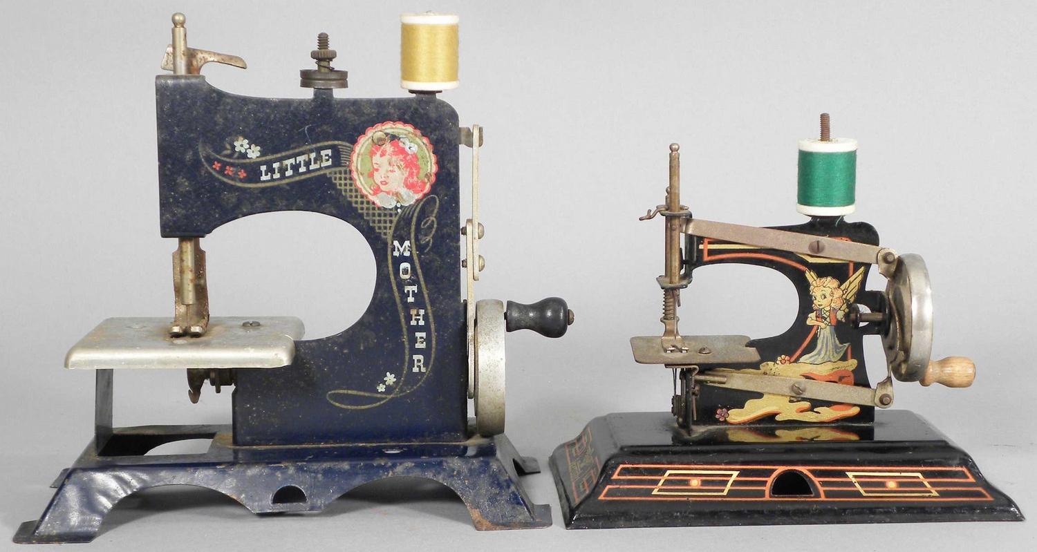 Lot of Two Childs Sewing Machine w/ original stenciling. Pressed metal. Casice model is painted with cartoon Robin Hood and tinker bell and the other is the "Little Mother". Both in good condition. Large one measures 8 X 7 X 4 inches.