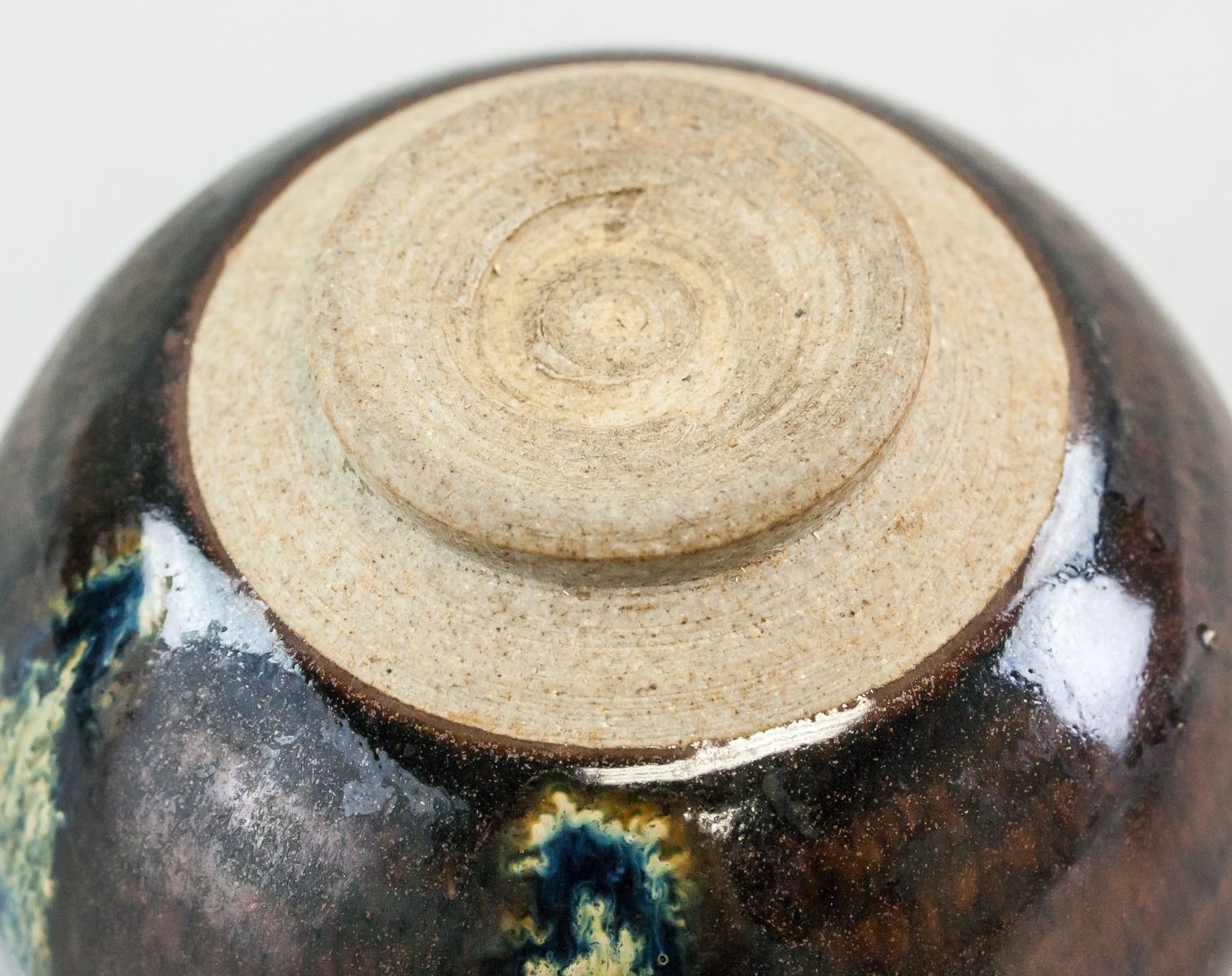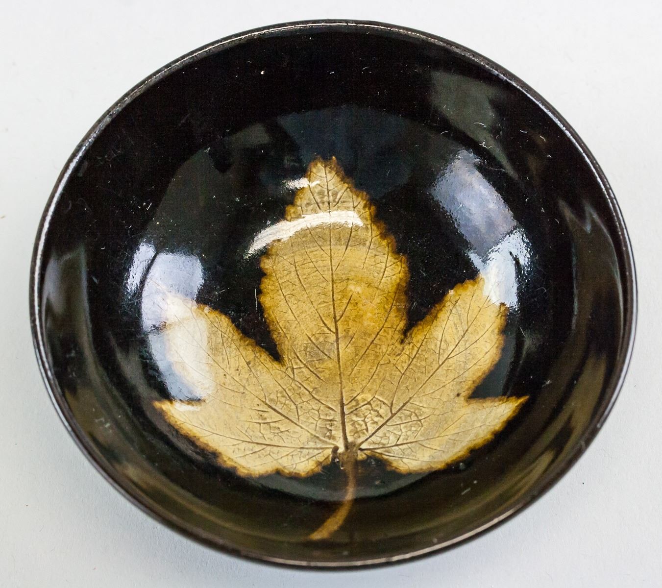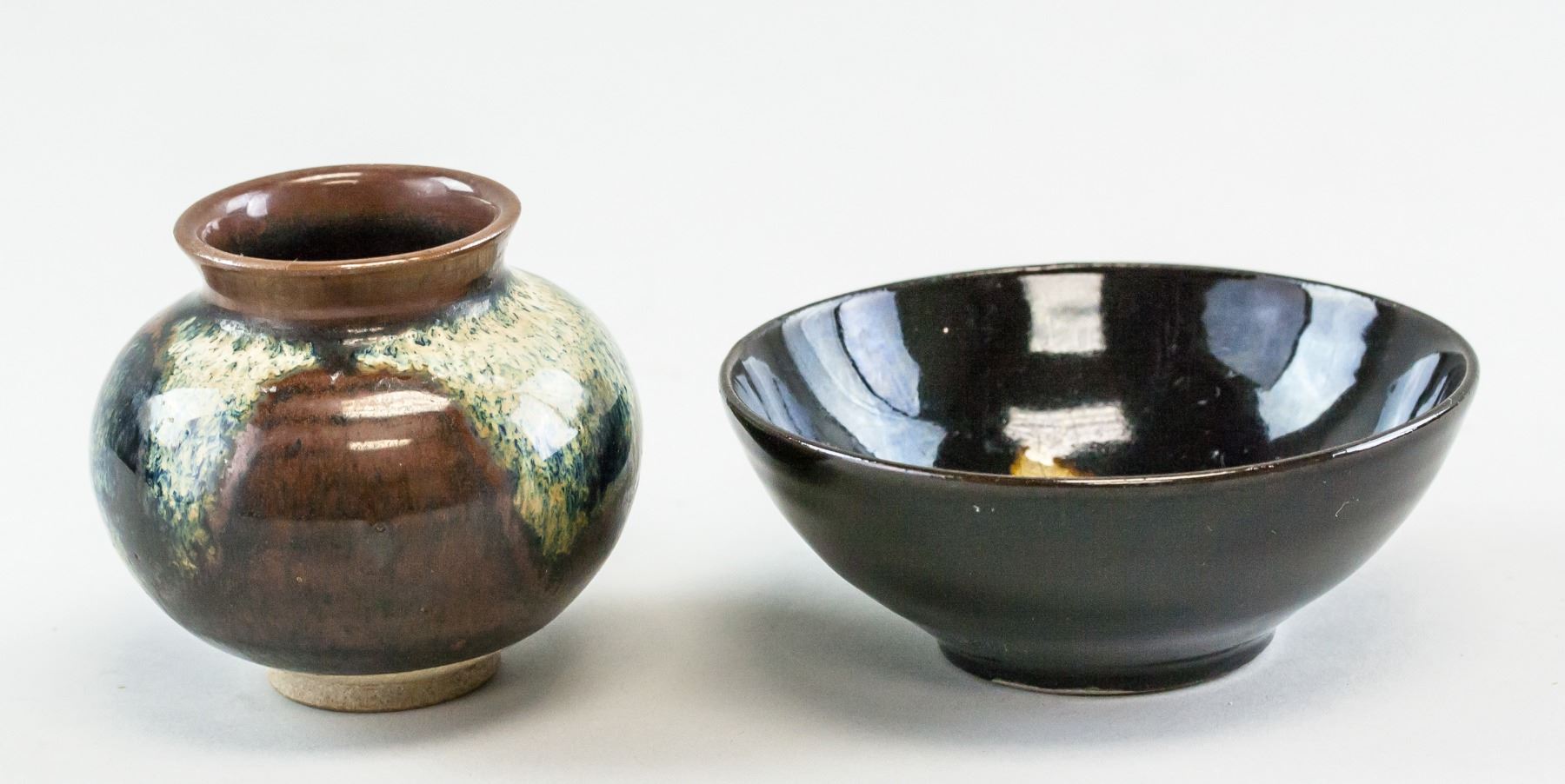 Lot of two (2) Chinese cizhou type bowl and jar. Jar is of round shape with large round opening and resting on short foot rim. Of brown tone with splashes of white and green. Bowl is of wide round opening, tapering to rest on short foot rim. Of black tone with gold-colored maple leaf inside. Height 4 cm, Diameter 11 cm, 264 g (Total) .