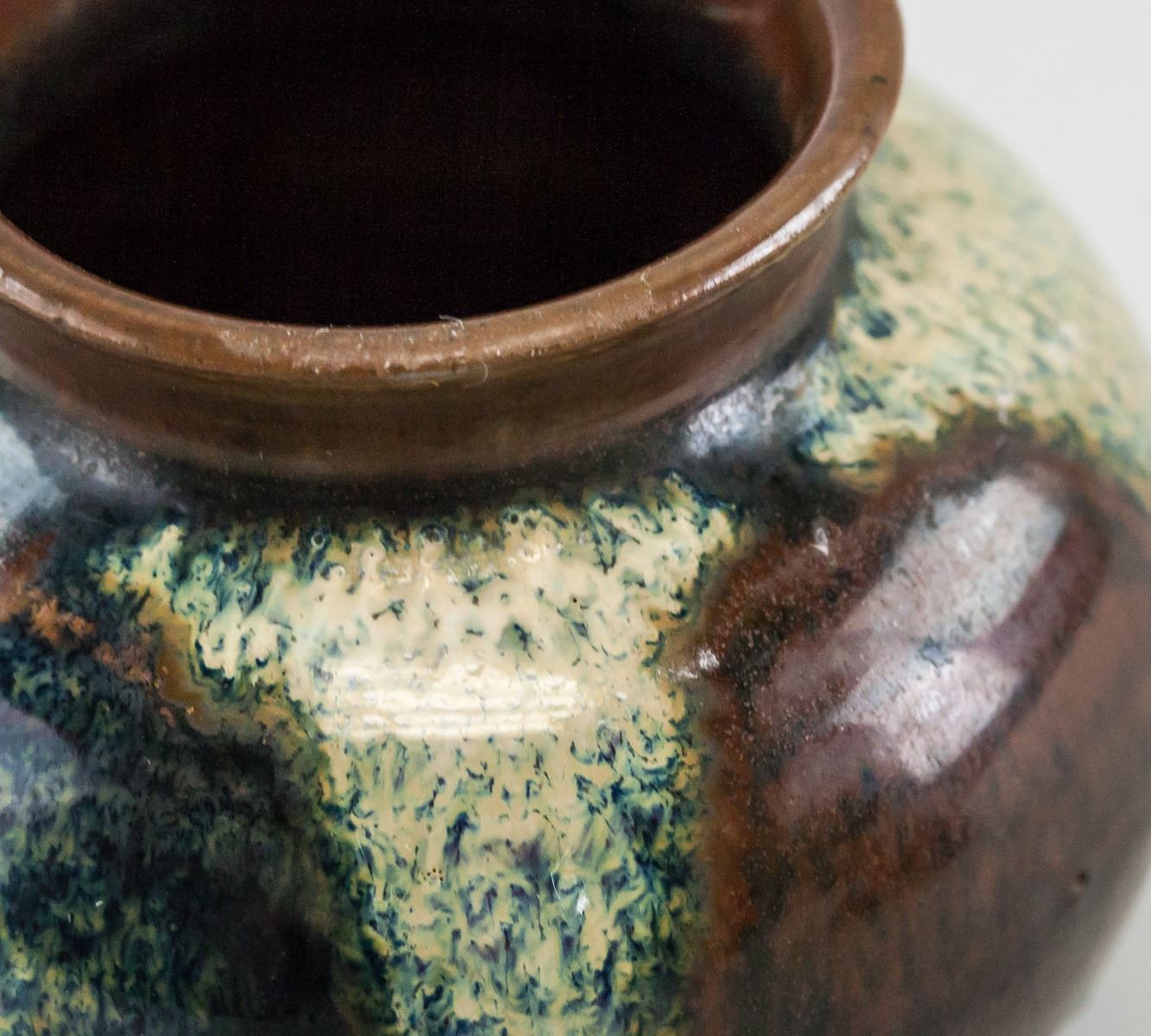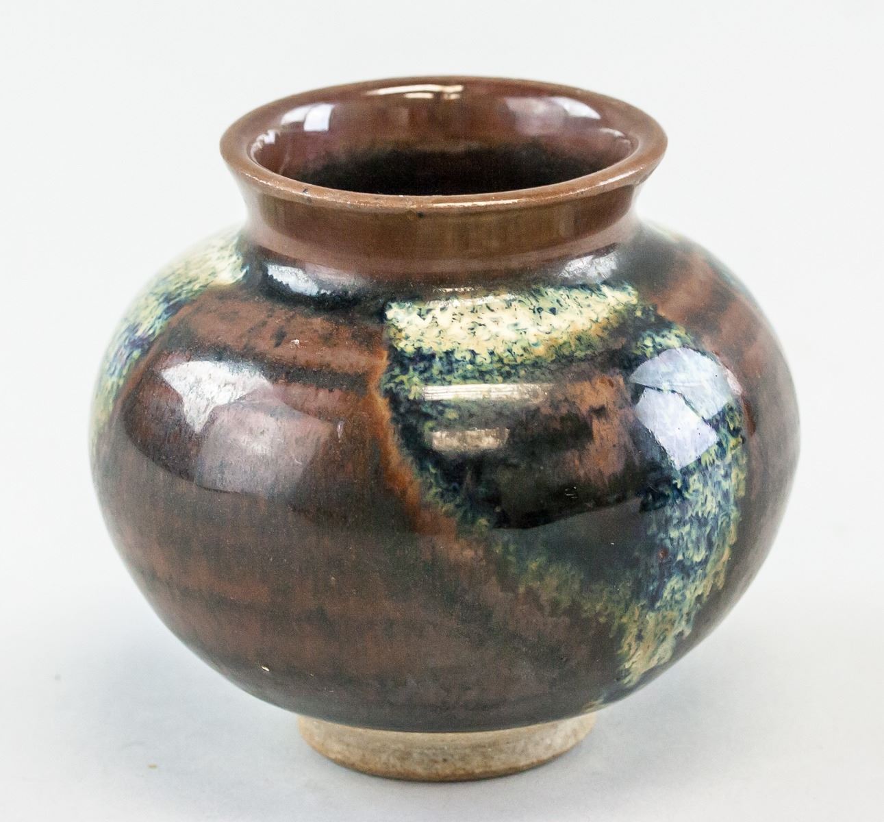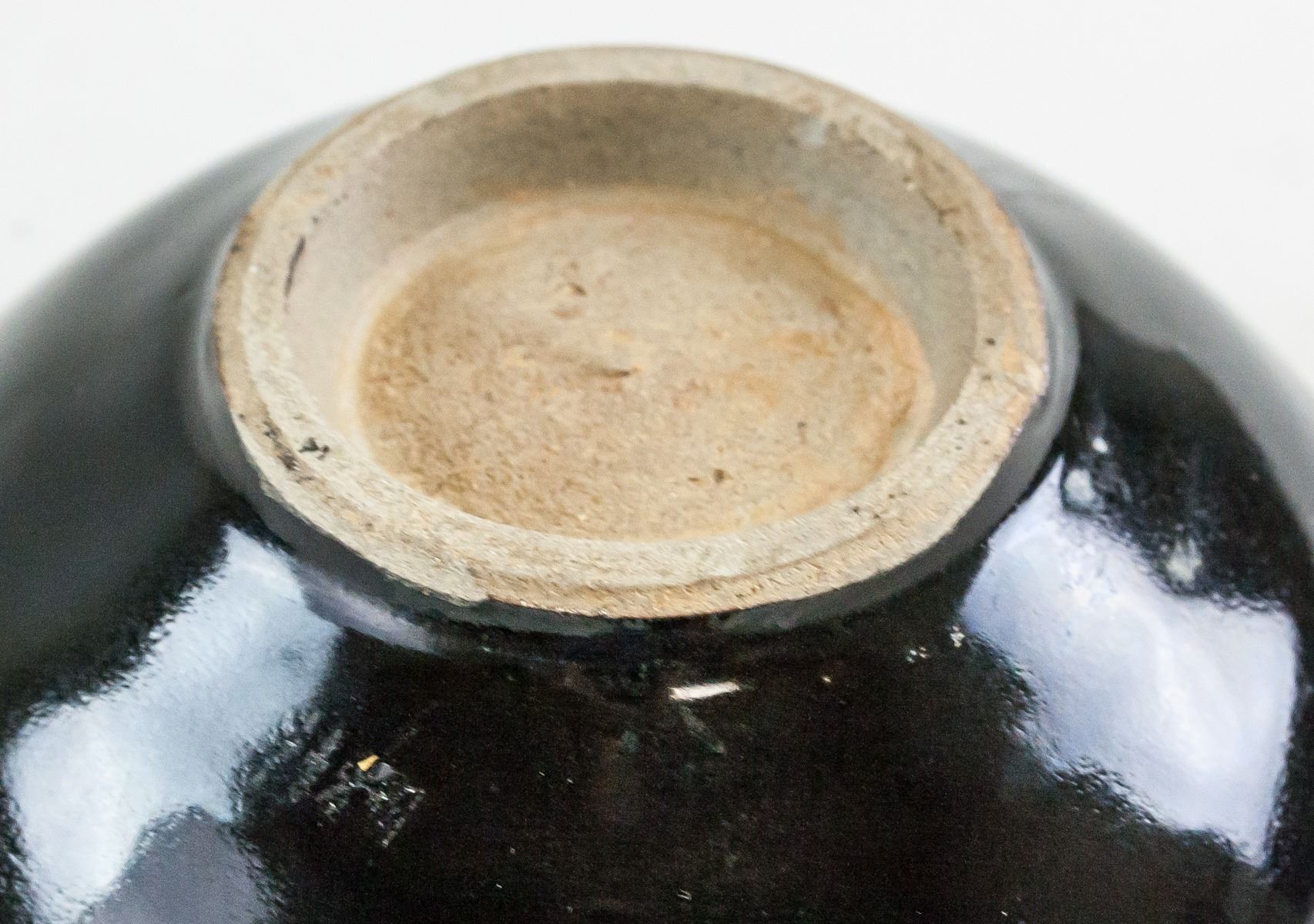 Lot of two (2) Chinese cizhou type bowl and jar. Jar is of round shape with large round opening and resting on short foot rim. Of brown tone with splashes of white and green. Bowl is of wide round opening, tapering to rest on short foot rim. Of black tone with gold-colored maple leaf inside. Height 4 cm, Diameter 11 cm, 264 g (Total) .