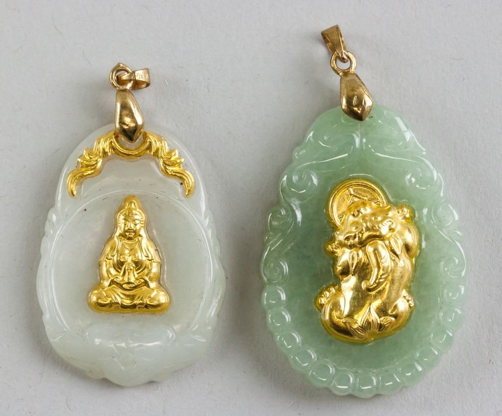 Lot of two (2) Chinese gilt jade pendant. Of white and green tone, respectively. Decorated with gilded Guanyin and beast. "Fu" character carved on back of white pendant. "A qian zhu jin" carved on back of green pendant. 4 x 2.7cm and 4.5 x 3.1 cm, 26 grams (total).