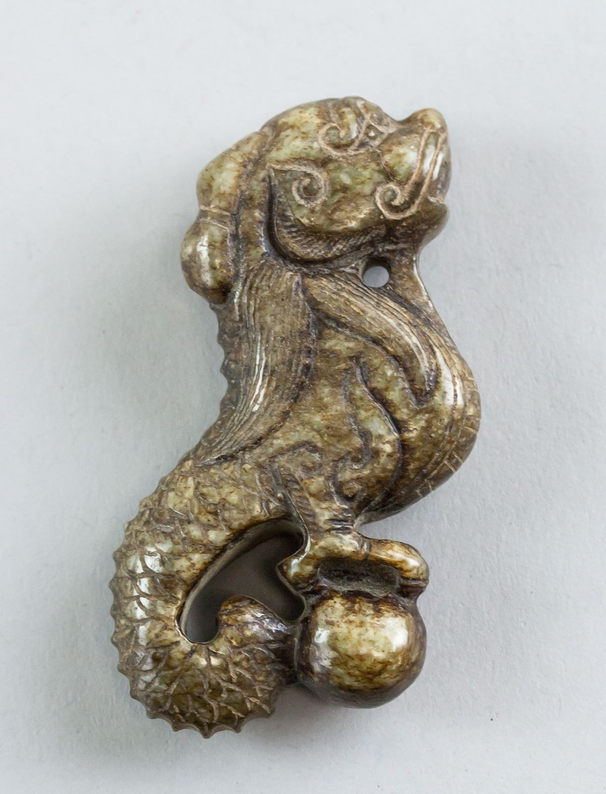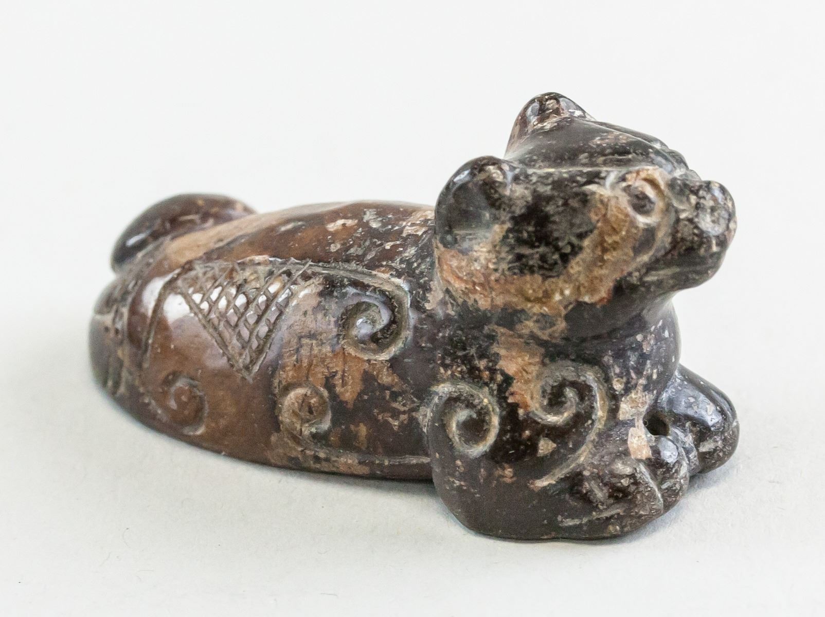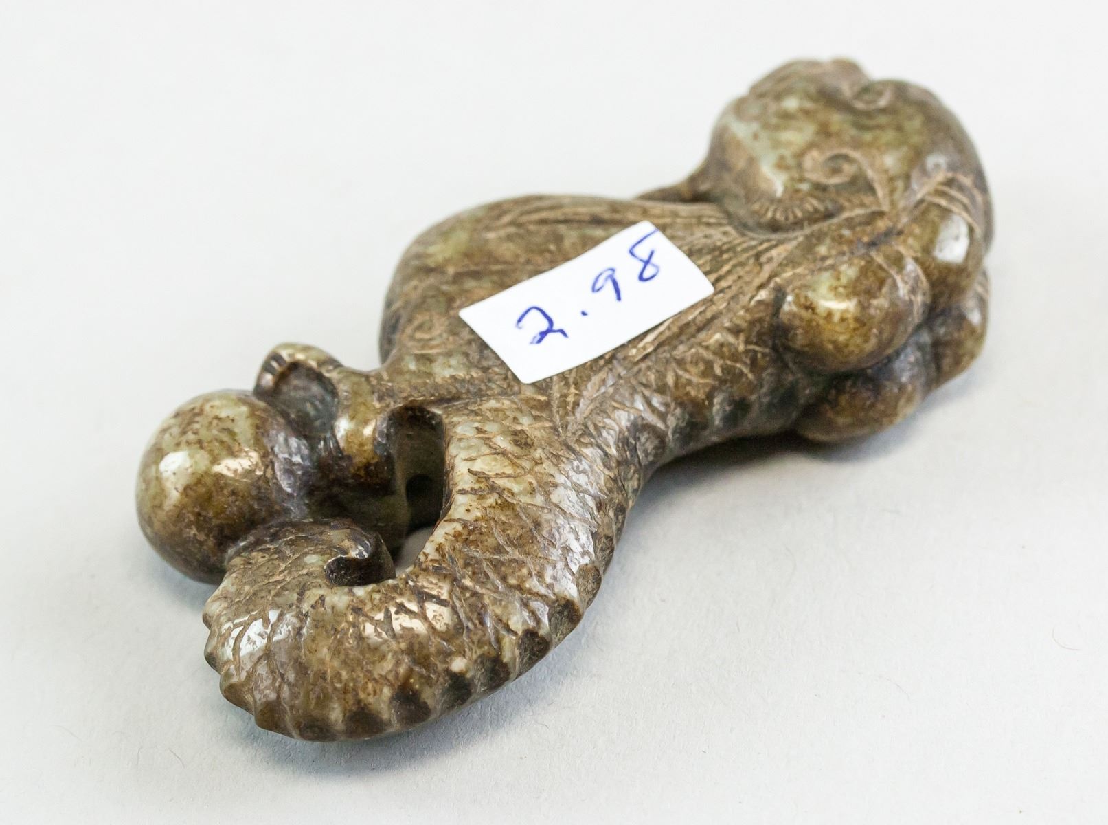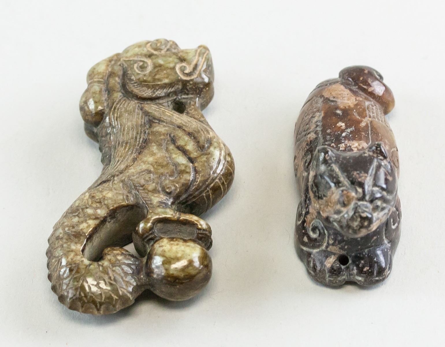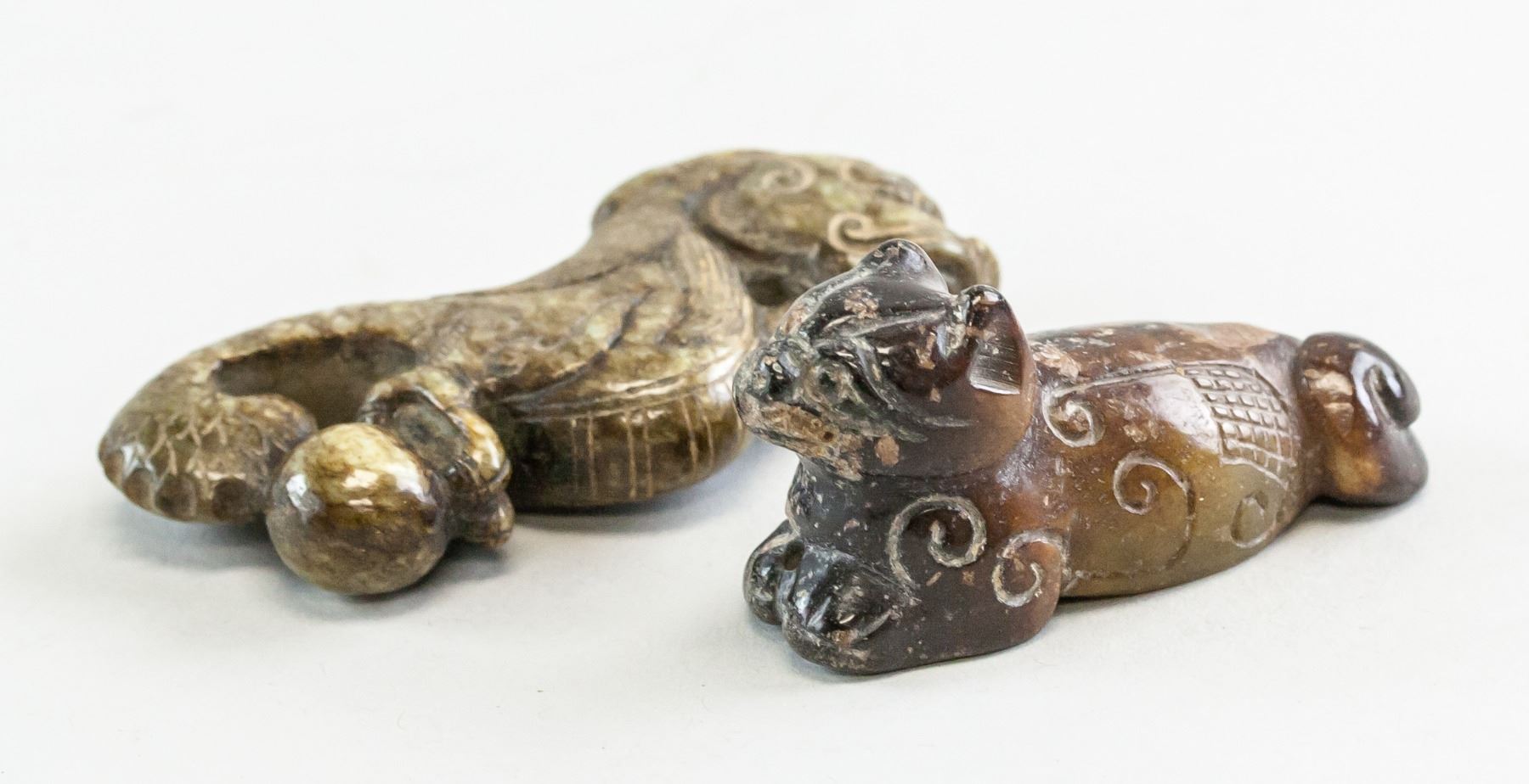 Lot of two (2) carved jade pieces. In the shape of a dragon and cat. 4 x 8 cm, 109 grams total. Dragon density: 2.98.