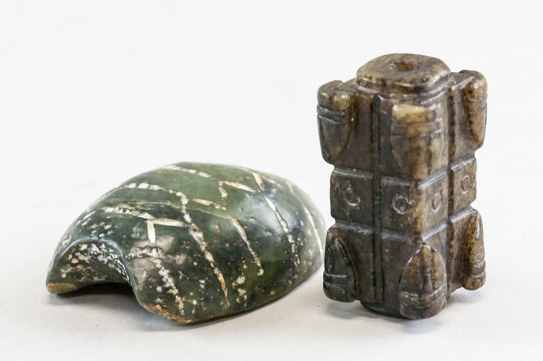 Lot of two (2) Chinese jade pendants. Of dark green and brown tone. Pierced for suspension. 4 x 2.5 cm, 104 grams (total).