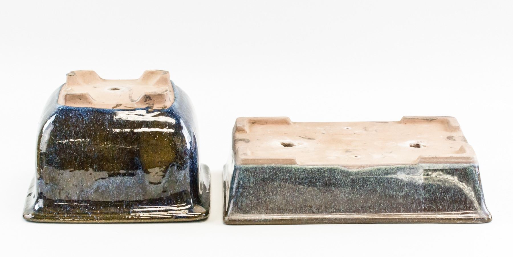 Lot of two Chinese porcelain planters. Of square and rectangular shape. Of deep blue and grey tone, speckled. Resting on short foot rims. H: 9 cm, W: 33 cm, 2.833 grams, 3.375 grams.