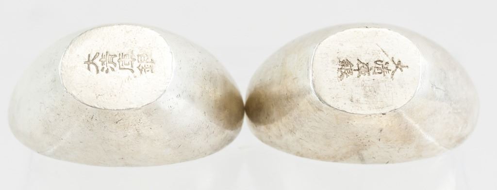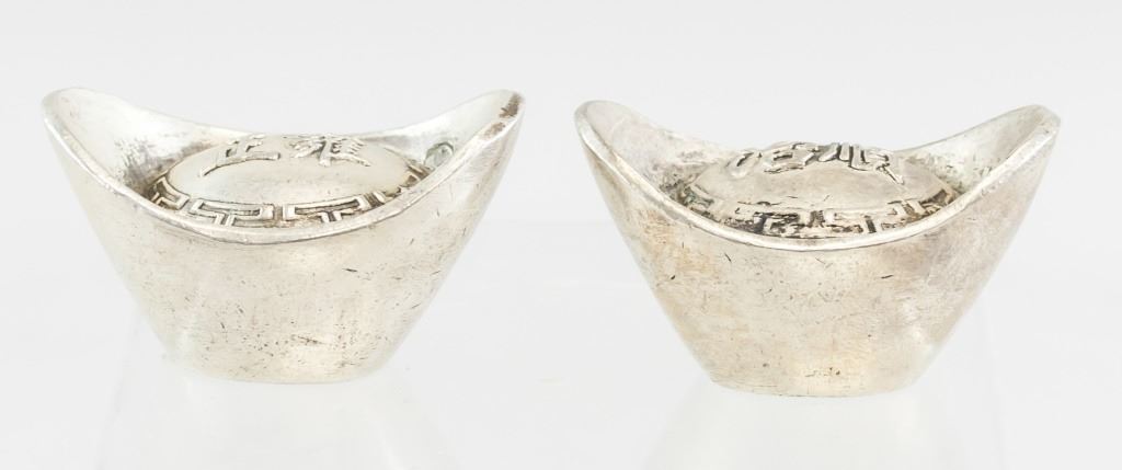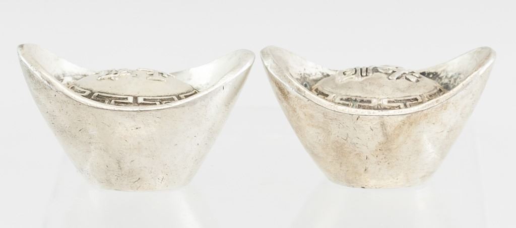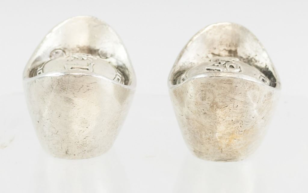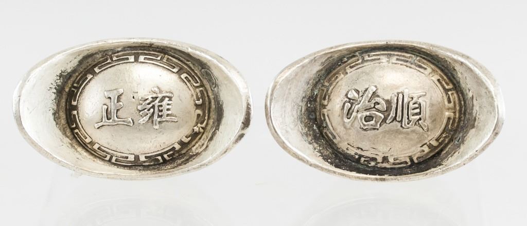 Lot of two (2) Chinese silver-colored ingot. Stamped with "Yongzheng" and "Shunzhi" on top. Stamped "Da Qing Ku Yin" on base. 5 x 7 cm, 554 grams total.