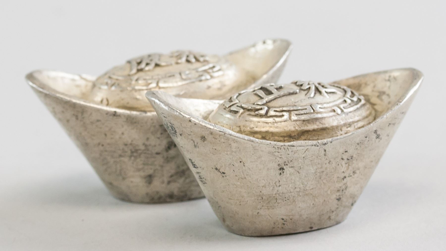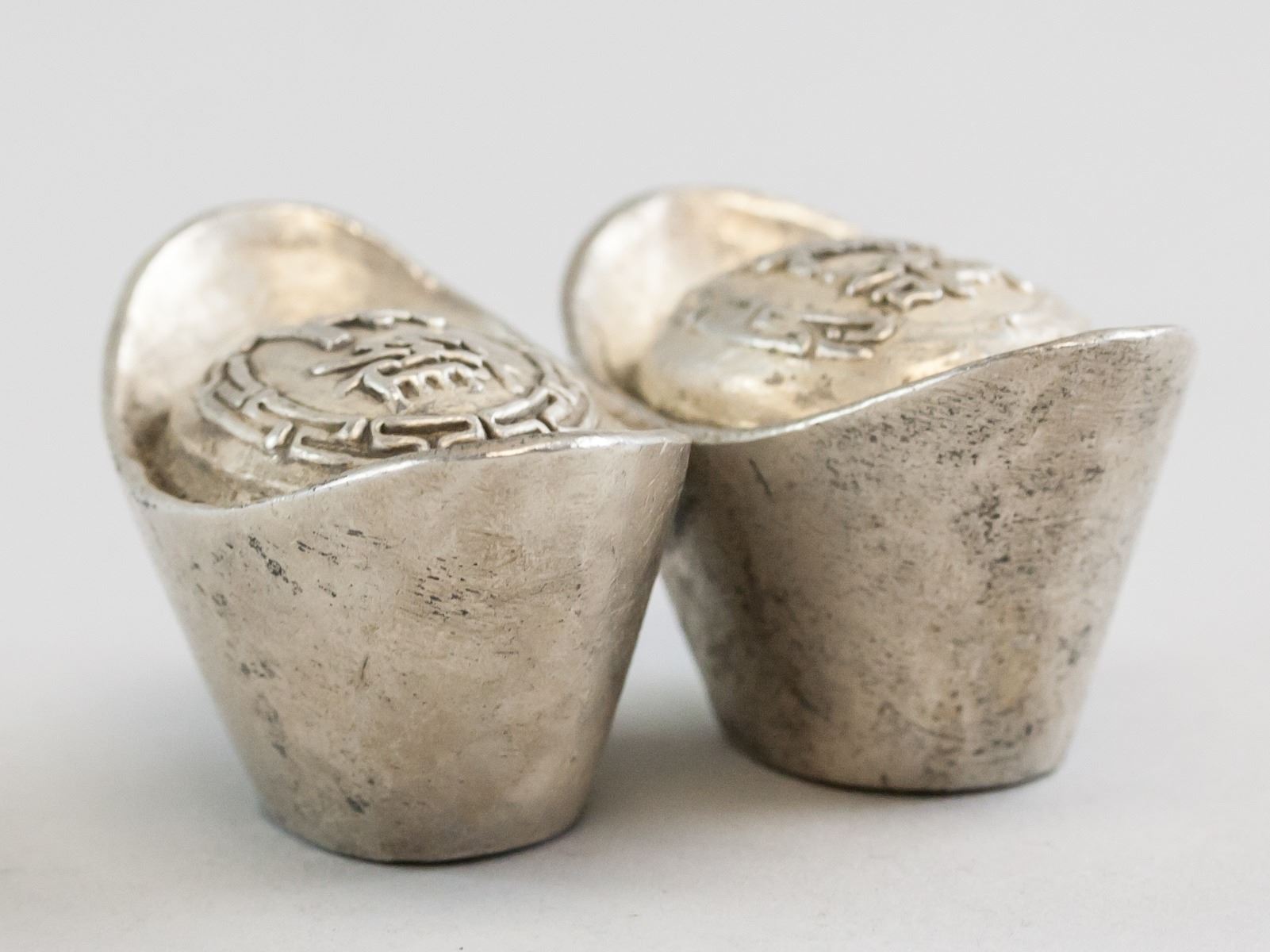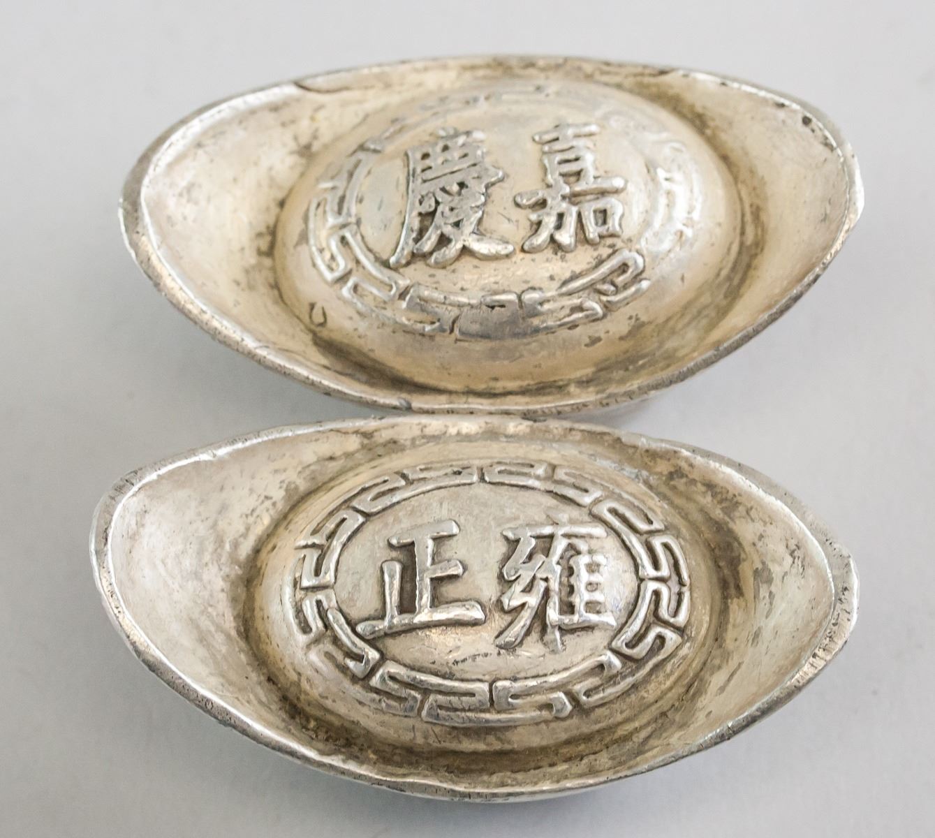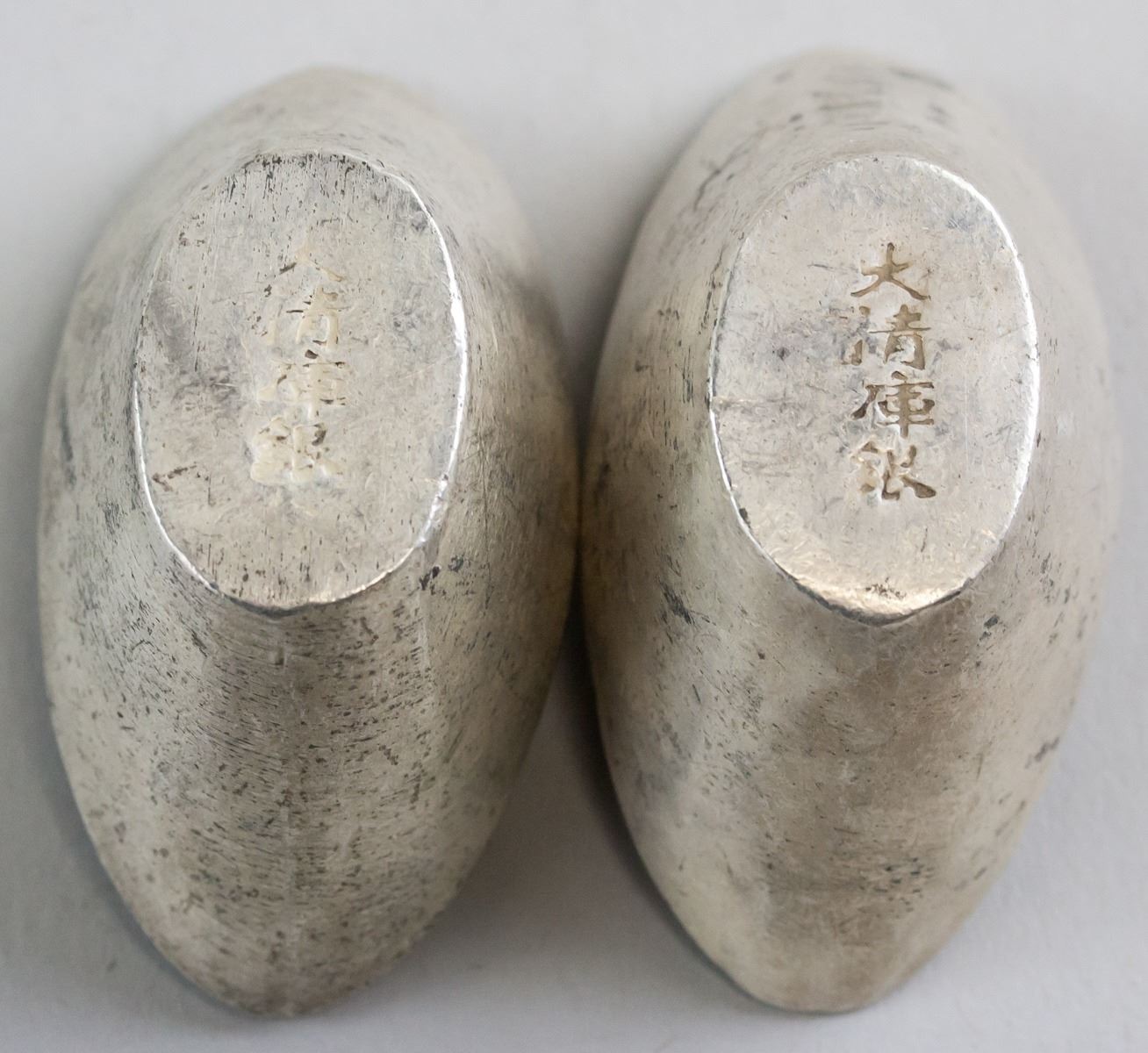 Lot of two (2) Chinese silvered ingots. Stamped with "Jia Qing" and "Yong Zheng" on top. Stamped with "Da Qing Ku Yin" on base. 4 x 6 cm, 304 grams total.