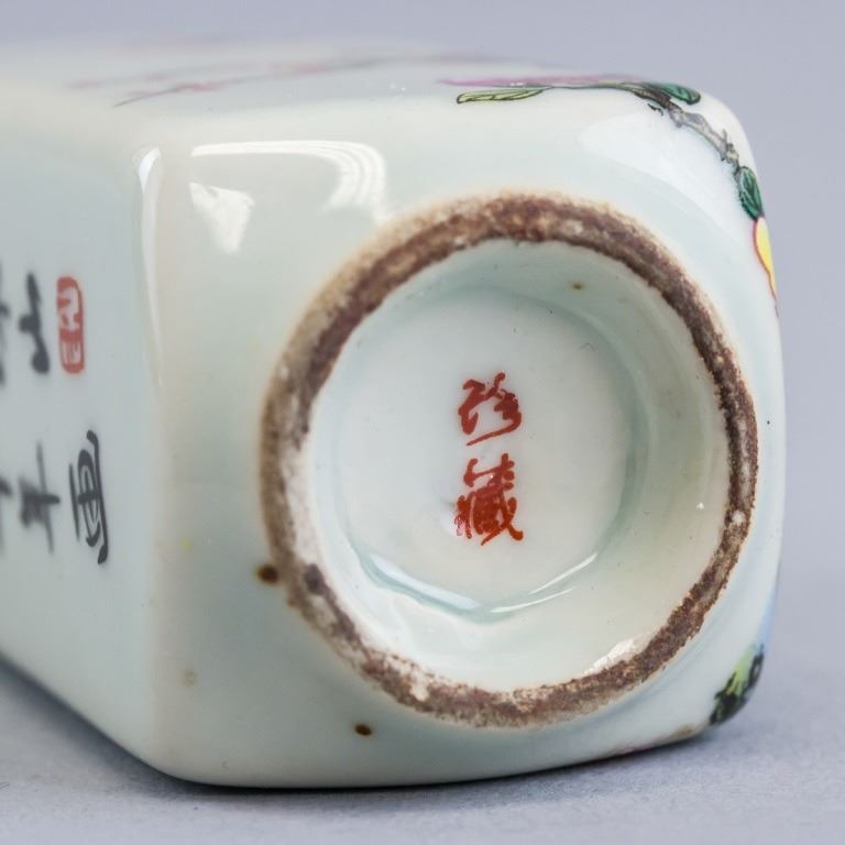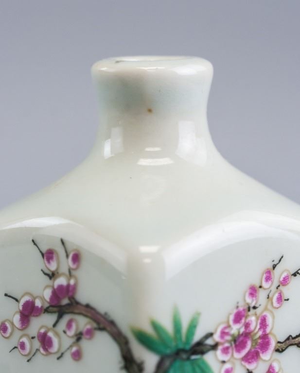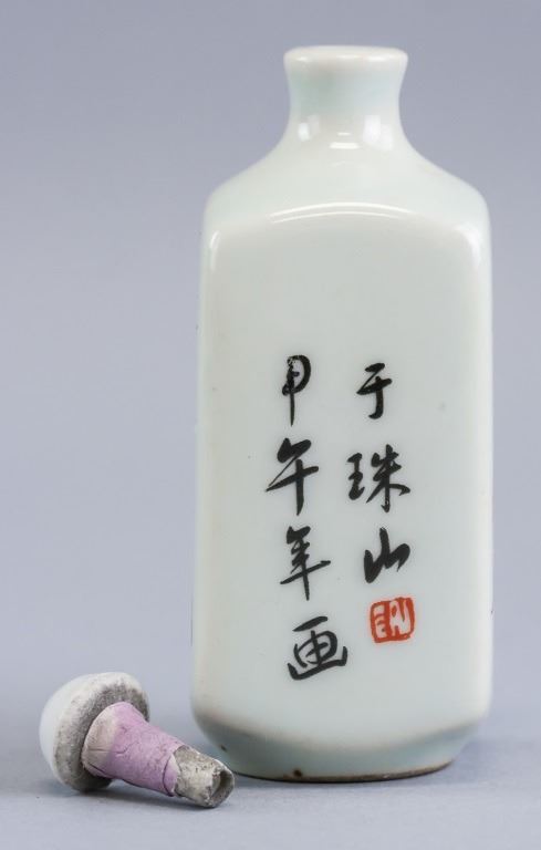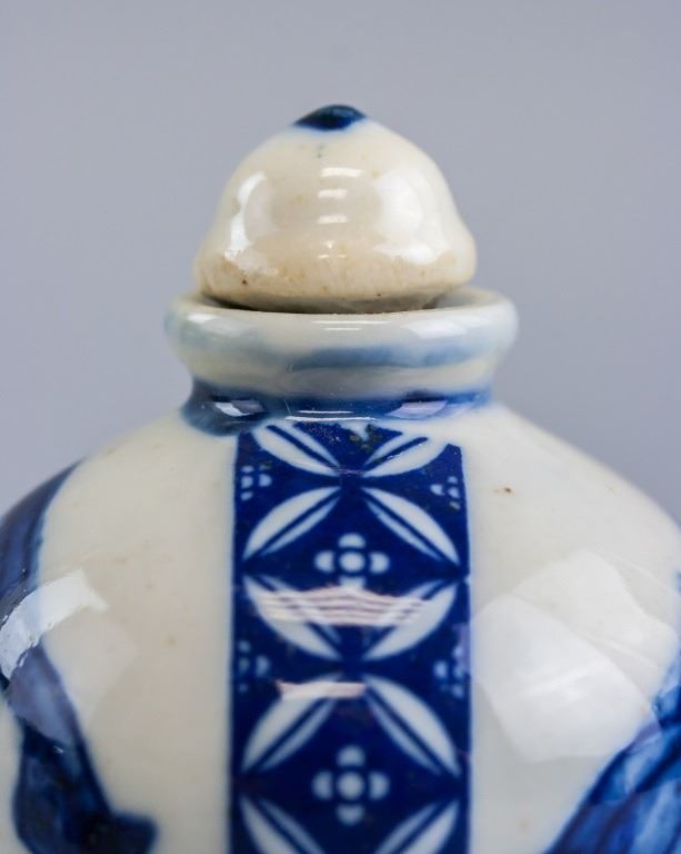 Lot of 2 Chinese porcelain snuff bottles. One of blue and white with nude scene, with four character Guangxu mark on base. Other of white porcelain with storks and flowers. 7 x 3 cm, 121 grams total.