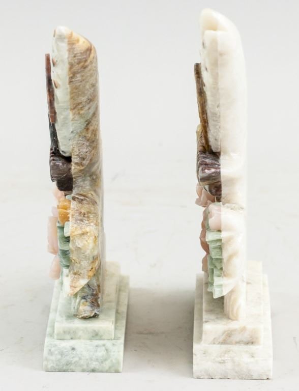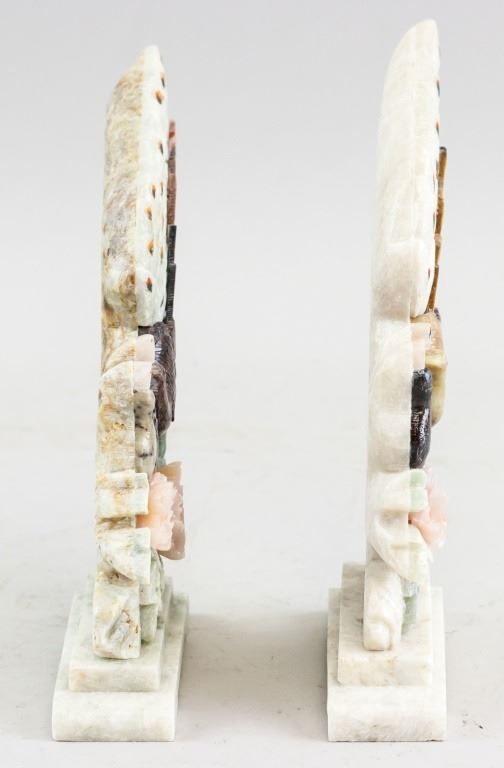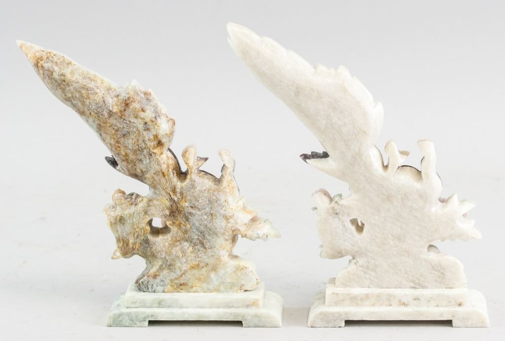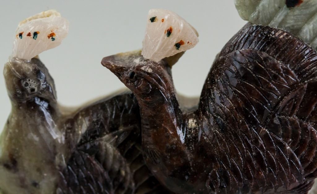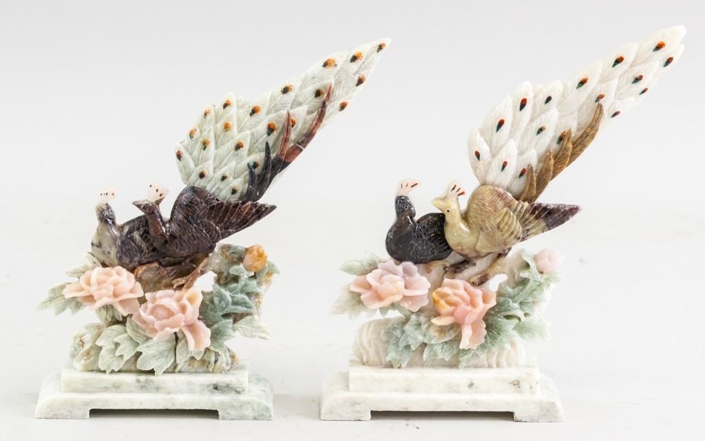 Chinese soapstone carved decoration. Featuring two sets of peacocks with flowers. On white speckled base. 17 x 16 cm. 866 grams (total).