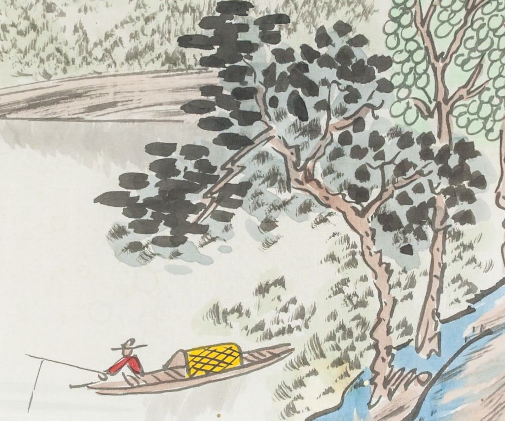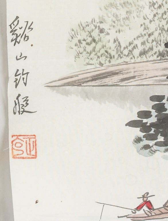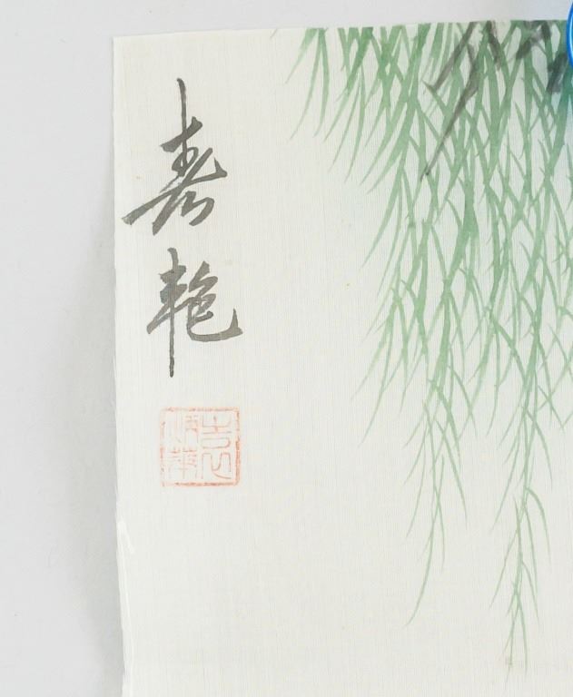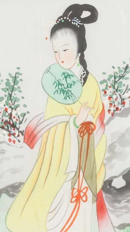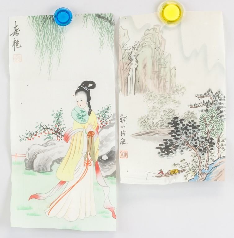 Lot of two (2) Chinese watercolor on silk. One featuring a woman holding a fan, the other features mountain scenery. Inscribed with one seal each. 34 x 17 cm.