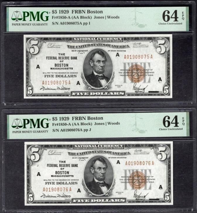 One Lot of Two Consecutive 1929 $5 Boston FRBN PMG 64EPQ.