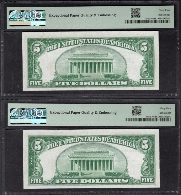 Lot of Two Consecutive 1929 $5 Boston FRBN PMG 64EPQ