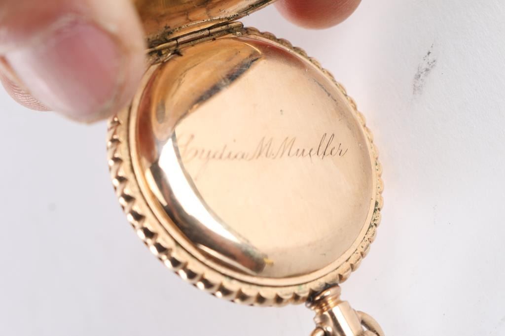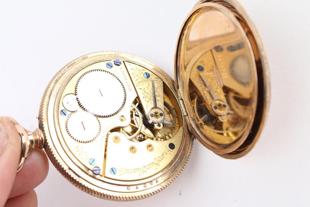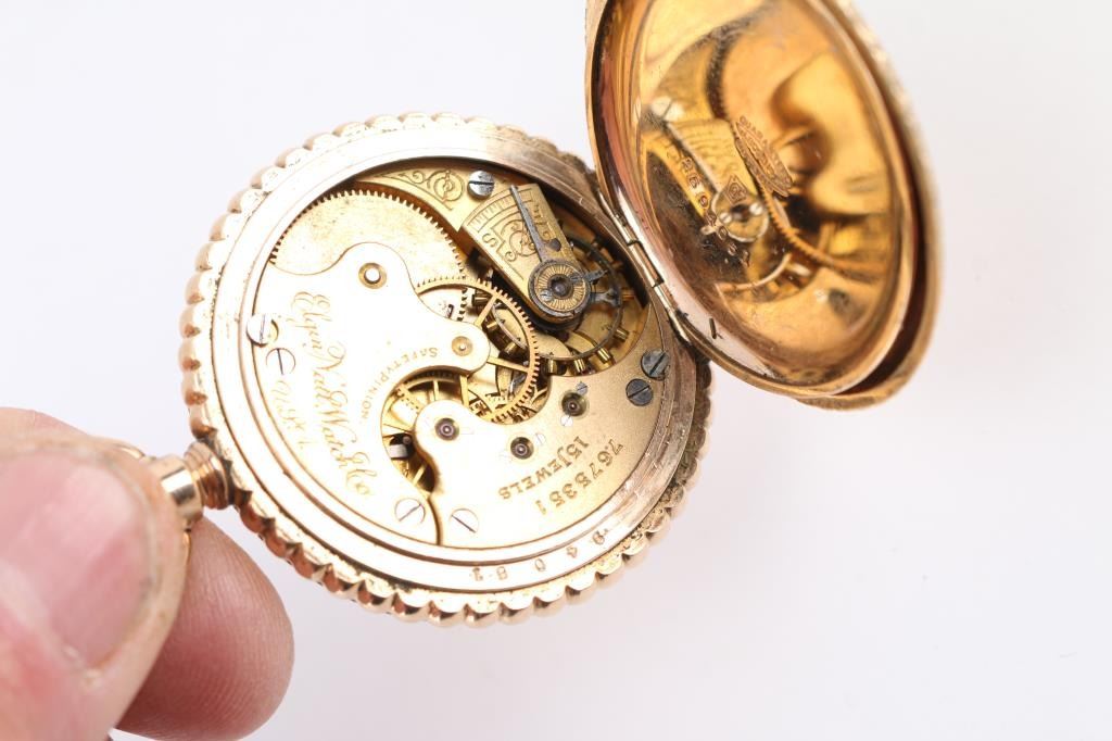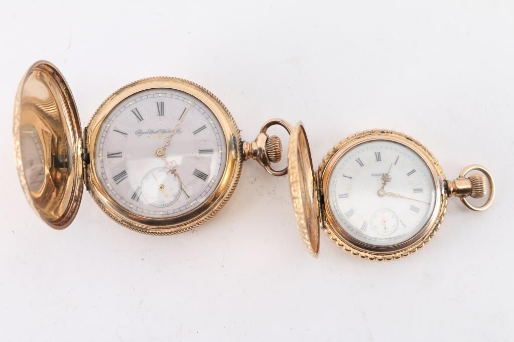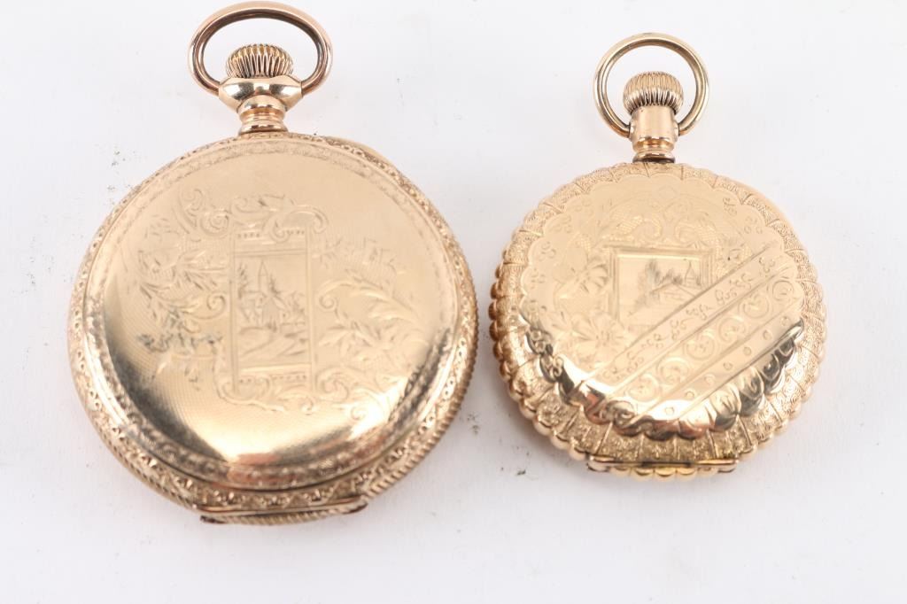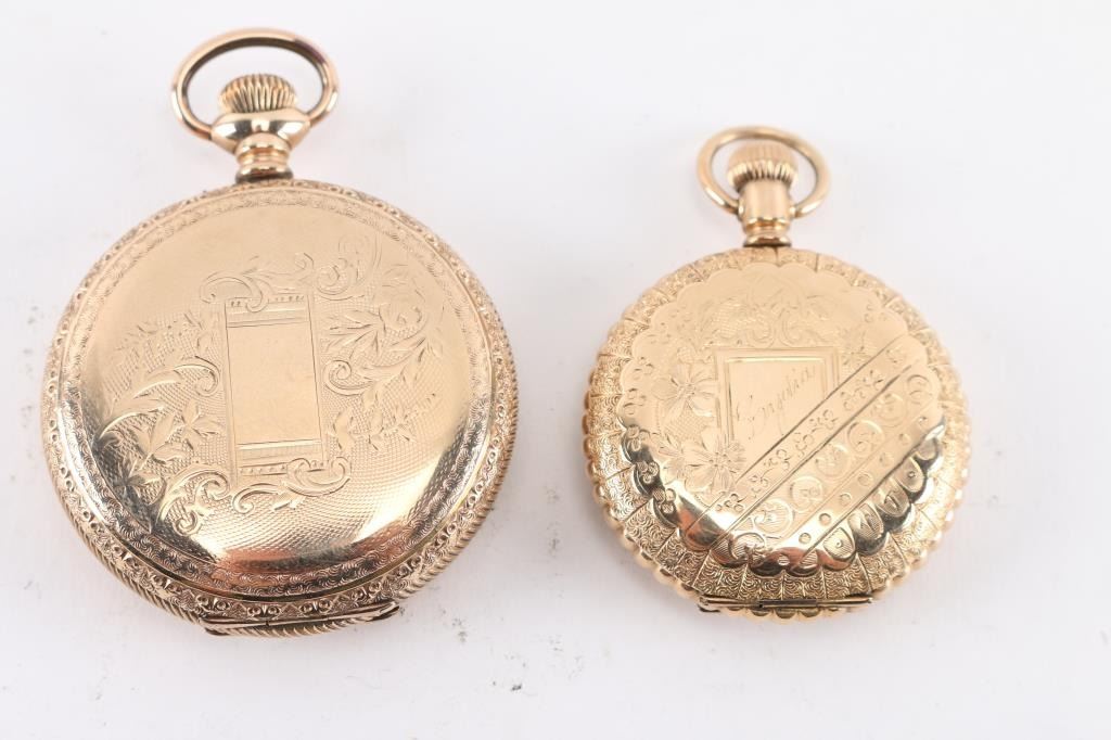 1) Elgin grade 151 model 6 16 size, 7 jewel. Number 6502169, manufactured 1897. Gold filled, engraved Keystone hunting case. In good working order. 2) Elgin grade 132 model 2, 6 size, 15 jewel. Number 7675351, manufactured 1899. Gold filled Keystone 20 year engraved hunting case. Inner movement cover is engraved " Lydia M. Mueller", fancy dial with Roman numerals. In good working order.