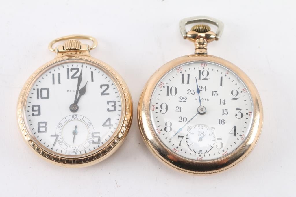 1) Elgin 336 grade model 5, 18 size, 17 jewel, ruby & sapphire. Number 18366818, manufactured 1915. Philadelphia 14K 20 year case In good working order. 2) Elgin 'B.W. Raymond' 478 grade model 15, 16 size, 21 jewel. Railroad grade. 12K gold filled case. Stem stamped "Elgin R.R." In good working order.